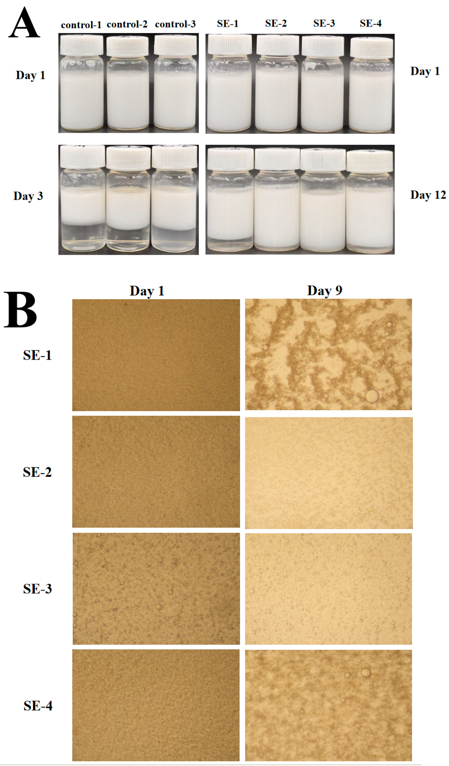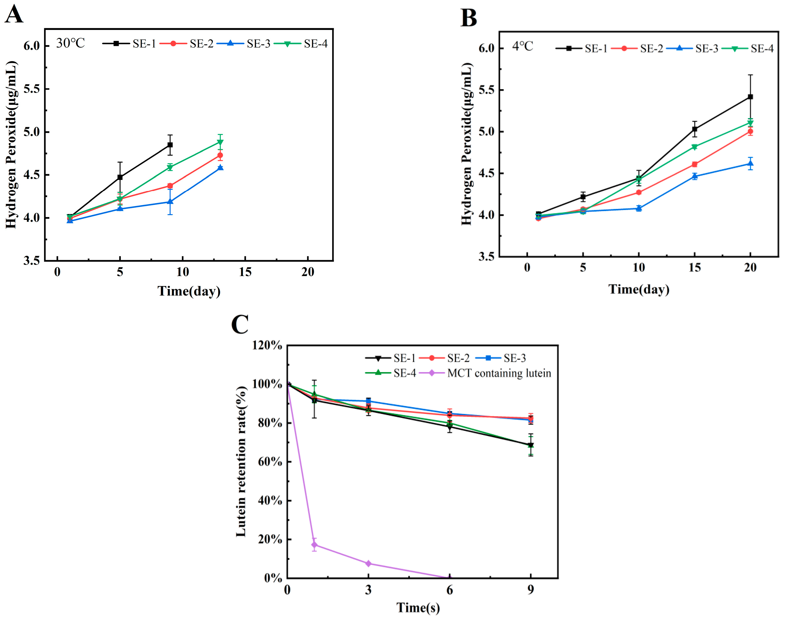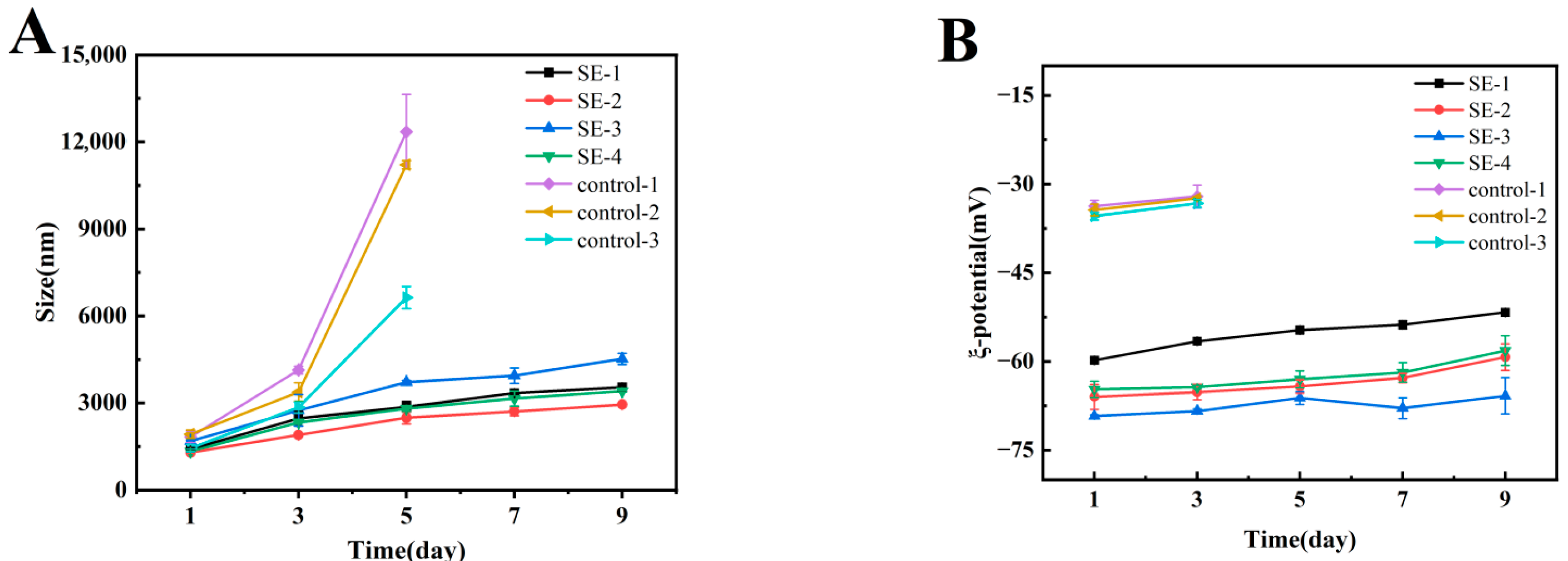 3.3. Droplet Size and ζ-Potential of Emulsion