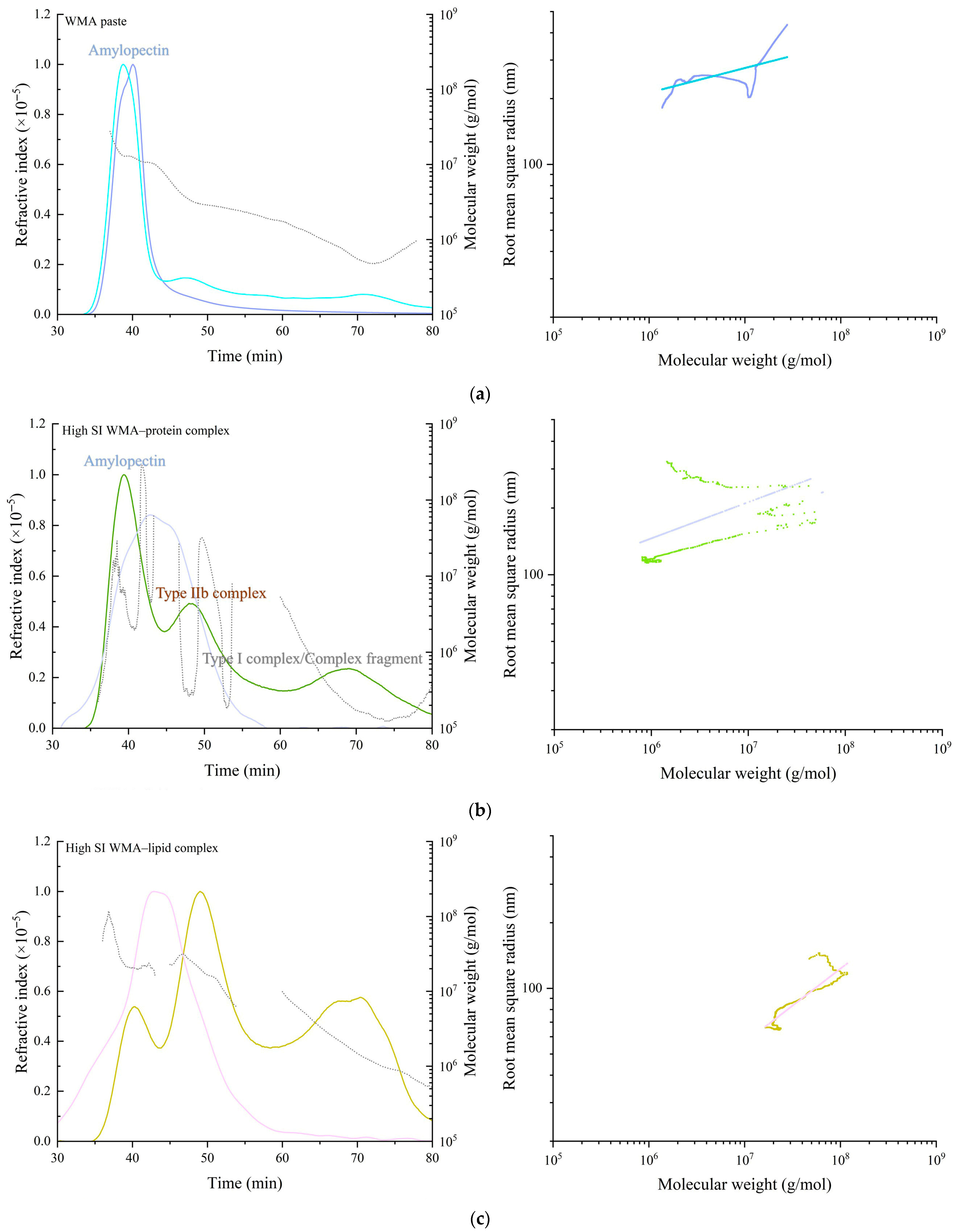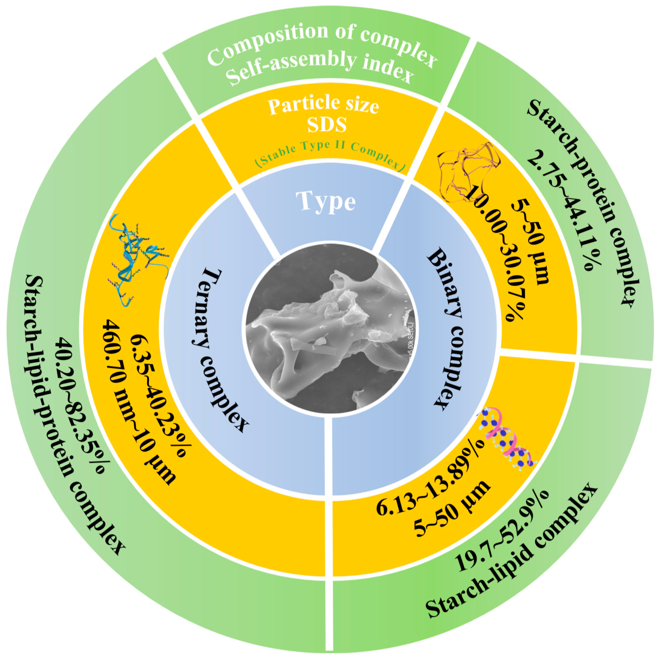 - Wang, S.; Chao, C.; Cai, J.; Niu, B.; Copeland, L.; Wang, S. Starch–Lipid and Starch–Lipid–Protein Complexes: A Comprehensive Review. Compr. Rev. Food Sci. Food Saf. 2020, 19, 1056–1079. [Google Scholar] [CrossRef] [PubMed]