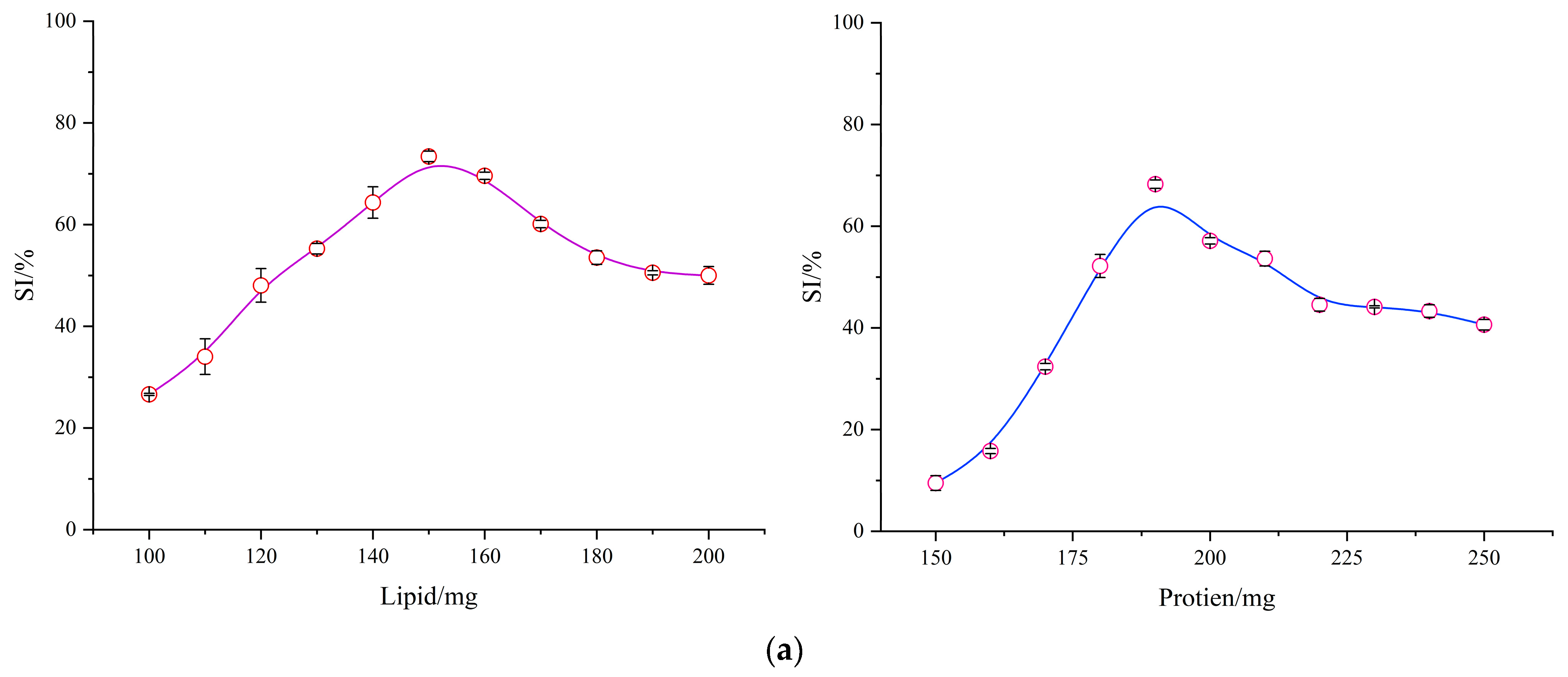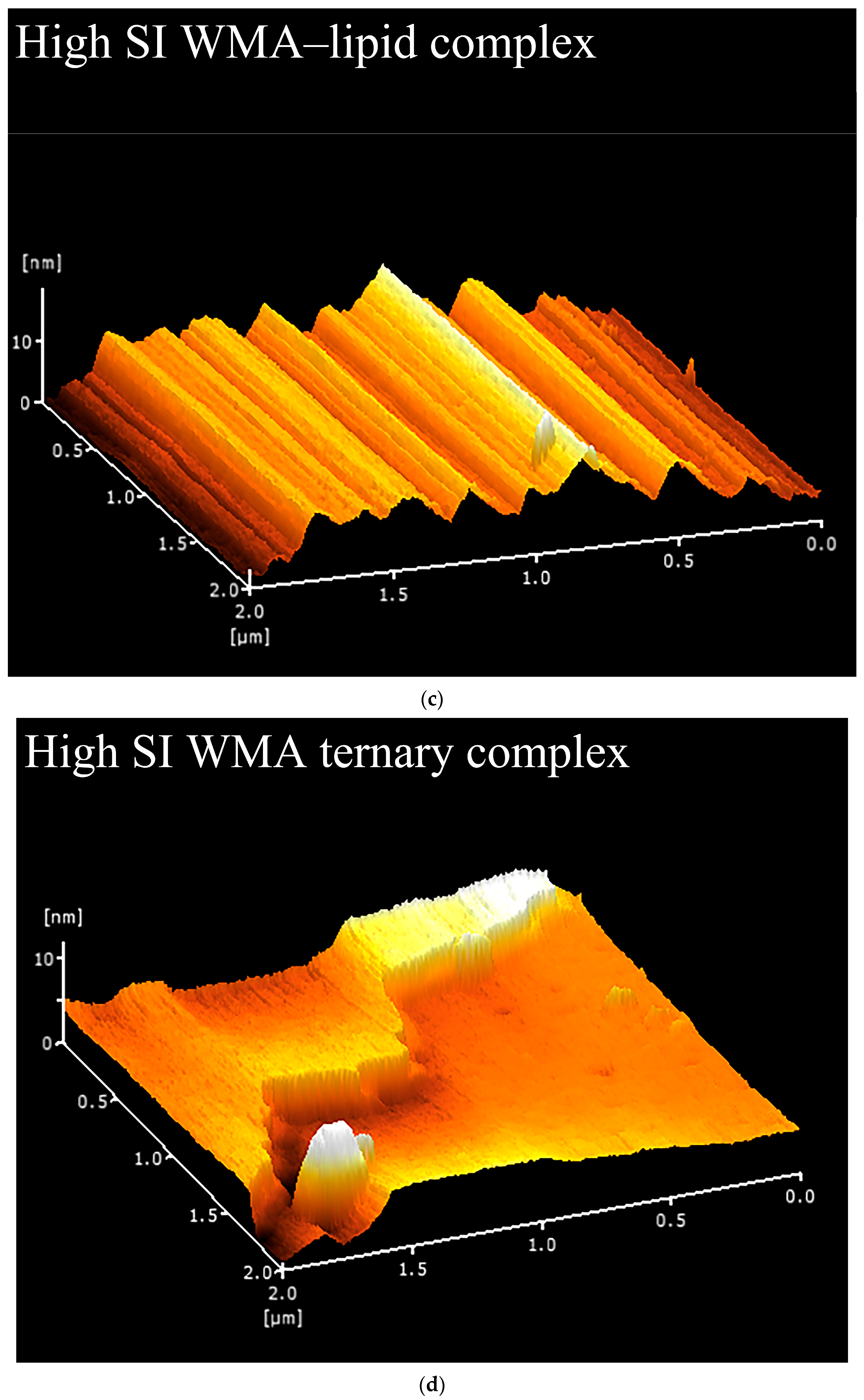 | High-SI WMA–lipid complex | 70.95 ± 0.90 c | 3.68 ± 0.03 c | 150 b | 71.54 ± 1.03 c | 1.92 ± 0.04 c | 540 a |