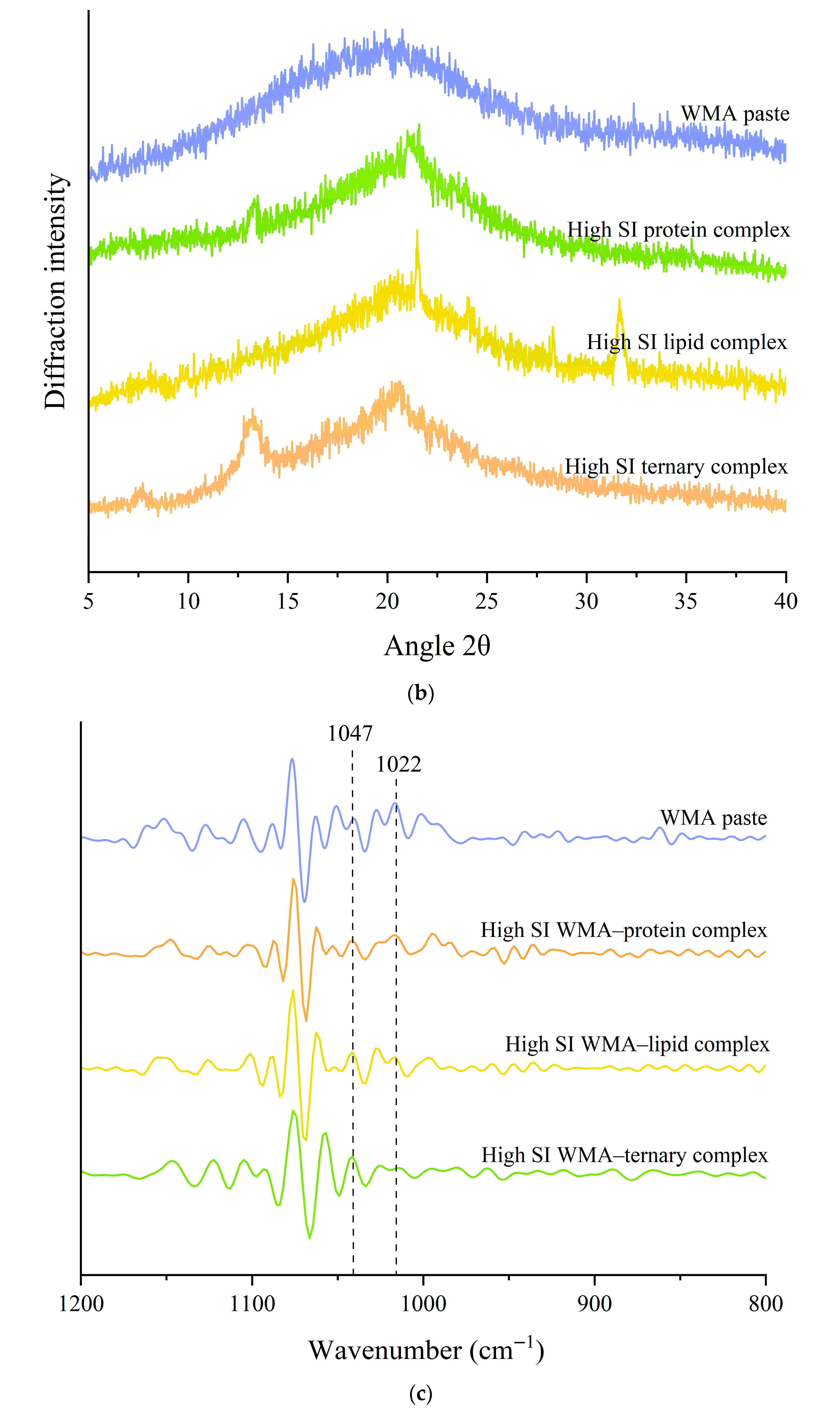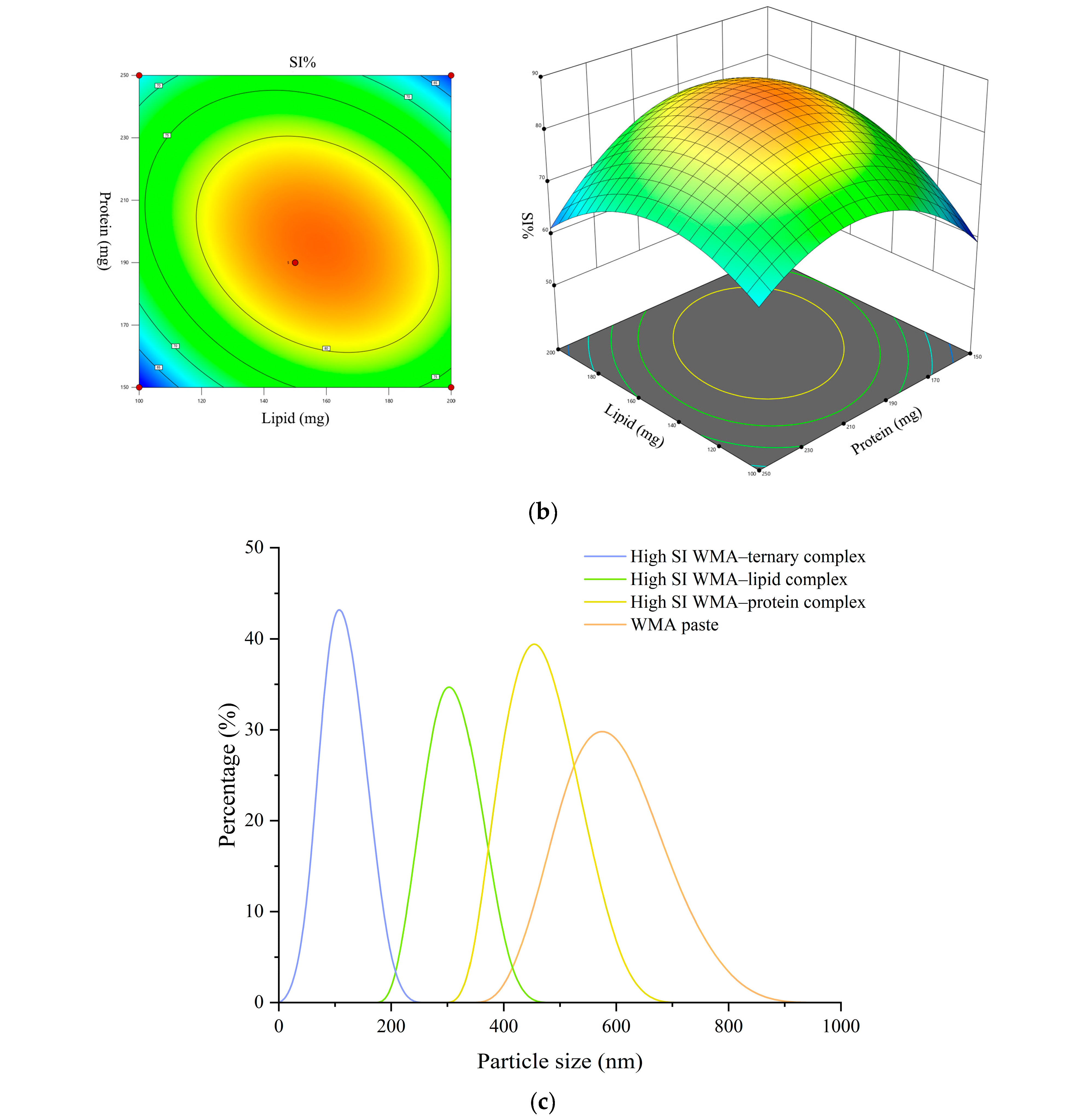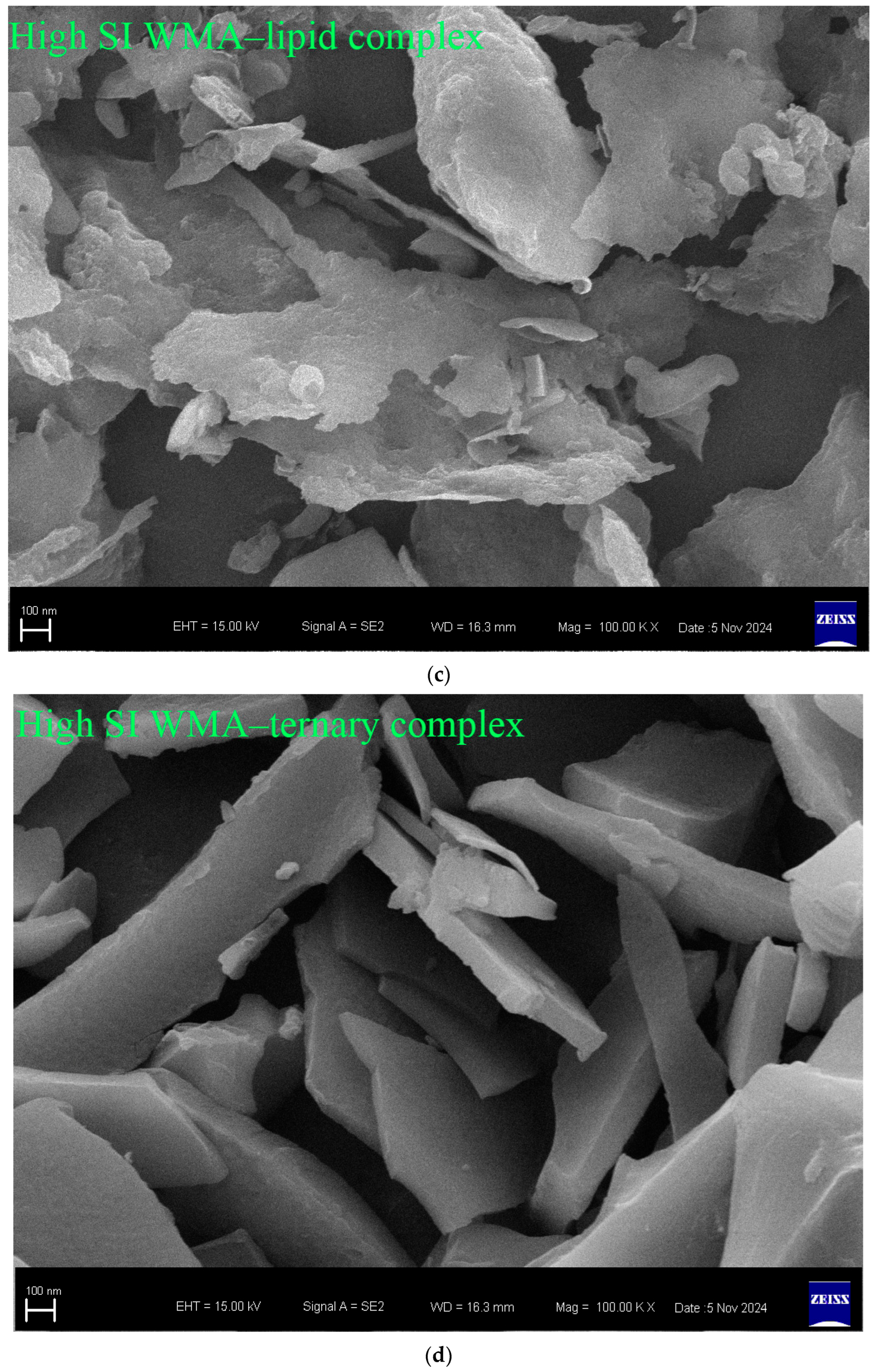 | High-SI WMA–lipid complex | 43.13 ± 0.13 c | 28.05± 0.08 b | 28.82± 0.18 b | 83.99 ± 0.19 c | 85.82 ± 0.17 c |