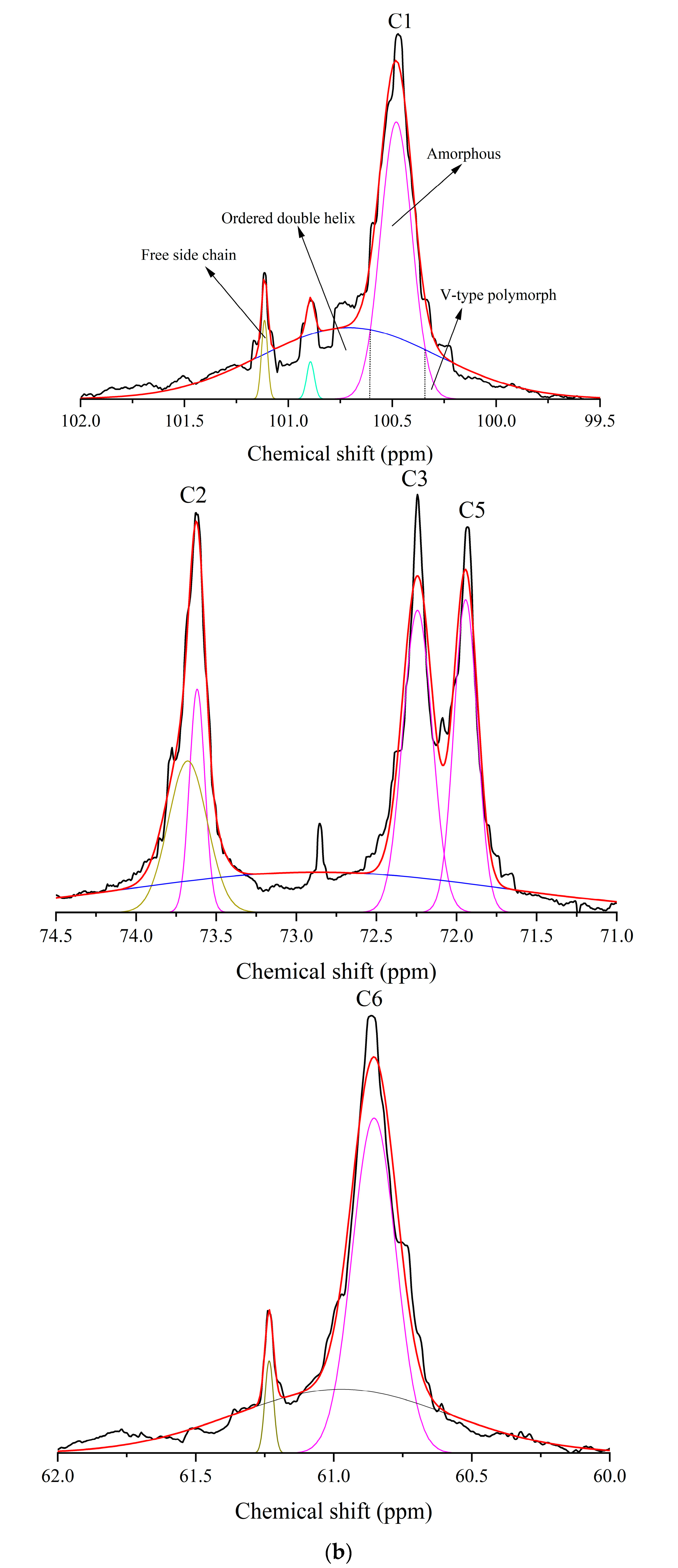 | Samples | Dhelix (%) | Vp (%) | Ac (%) | CH2OH (%) | α-1,6 (%) | α-1,4 (%) |