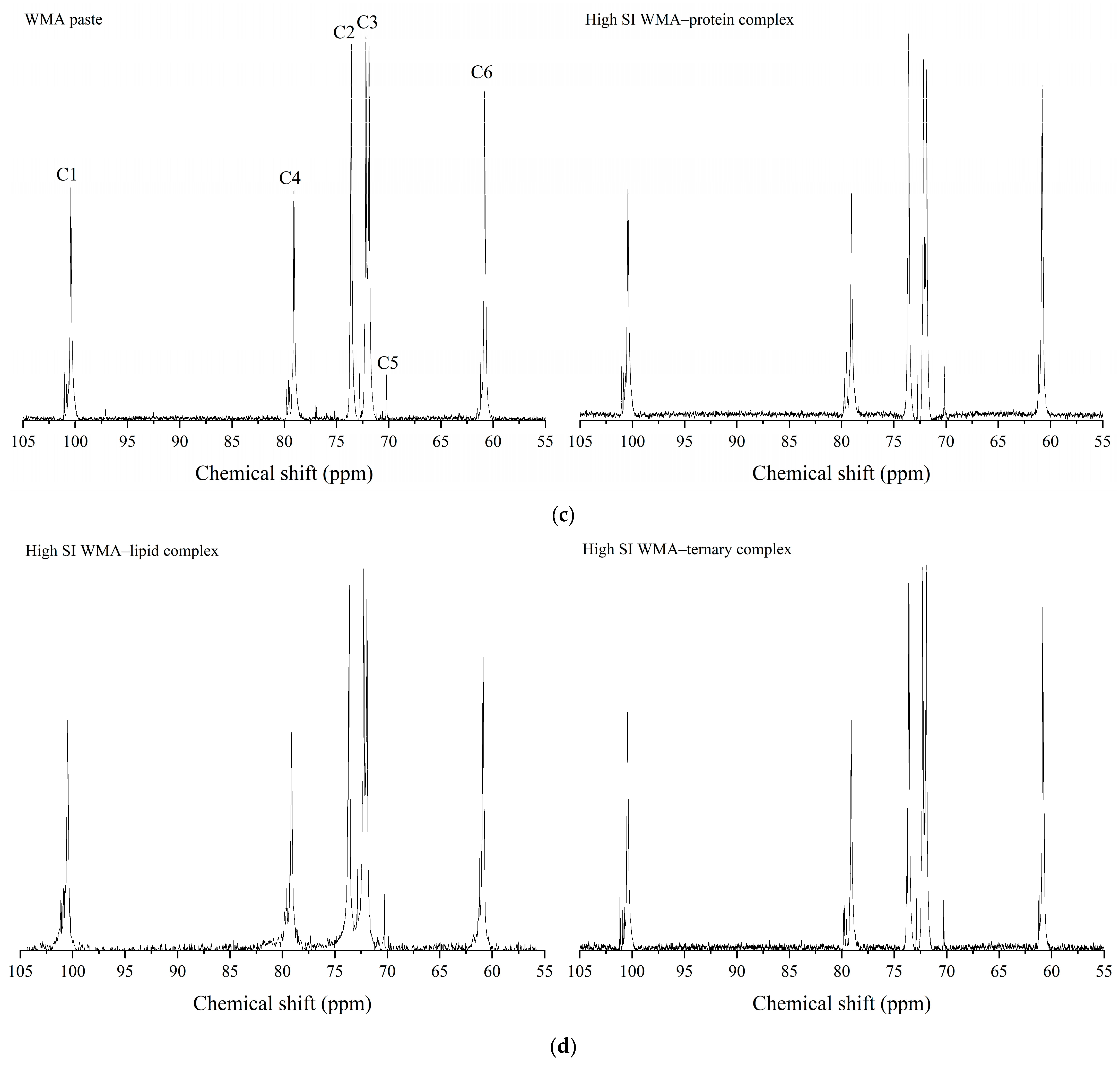 | High-SI WMA–protein complex | 27.17 ± 0.37 c | 6.11 ± 0.06 c | 66.72 ± 0.83 b | 8.61 ± 0.02 c | 7.51 ± 0.02 c | 92.49 ± 0.56 b |