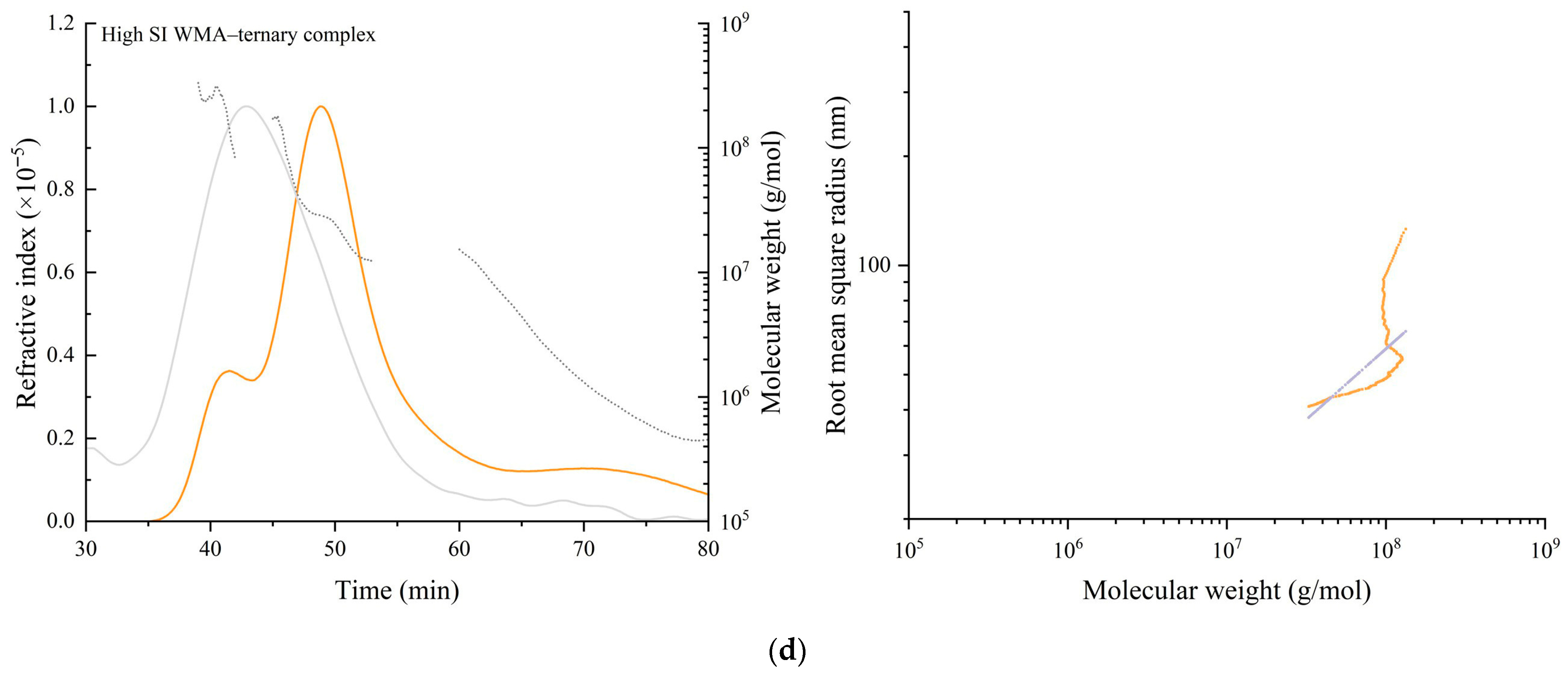 | Samples | Mn (×107 Da) | Mw (×107 Da) | Rg (nm) | PI | ν | ρ (g mol−1 nm−3) |