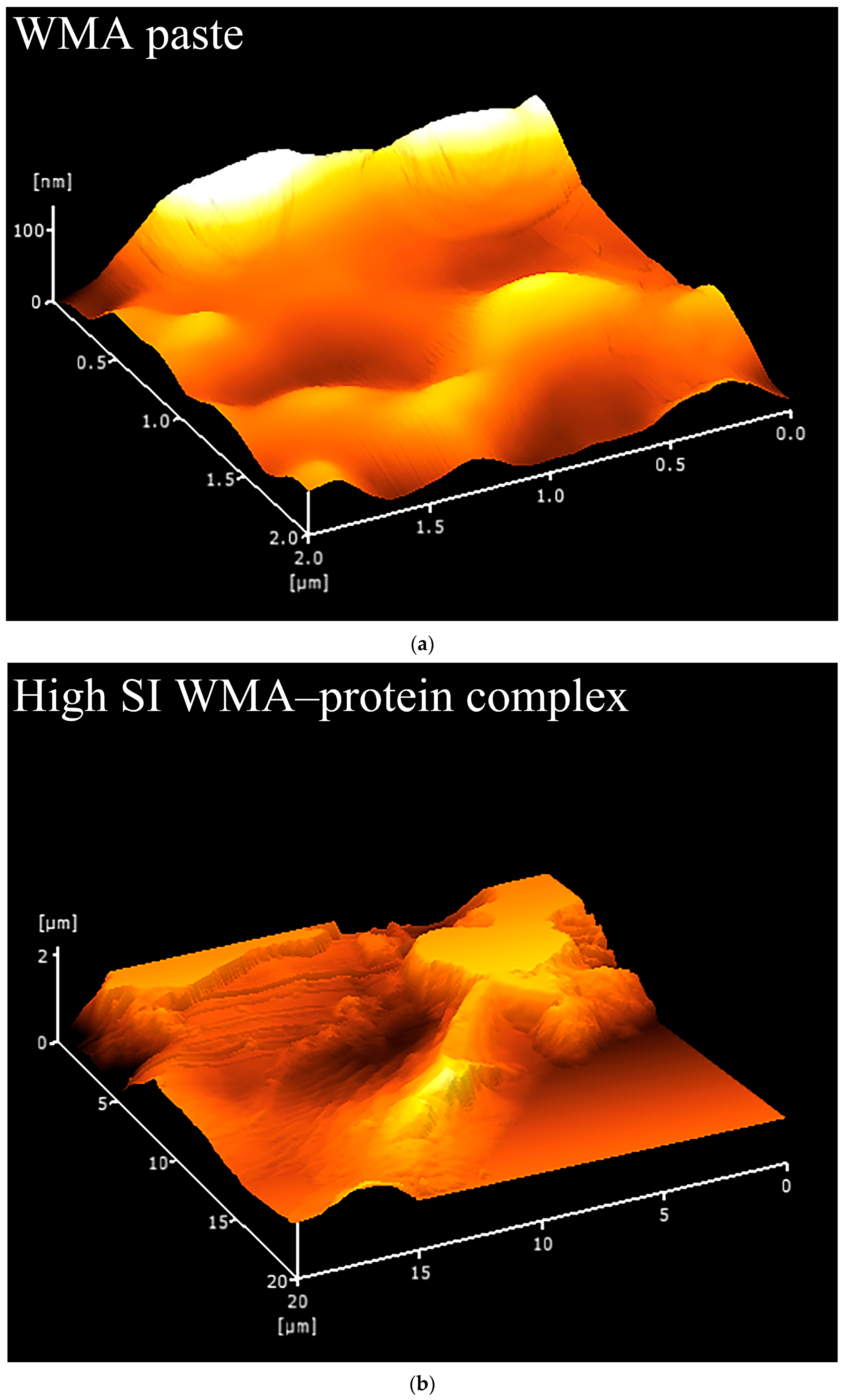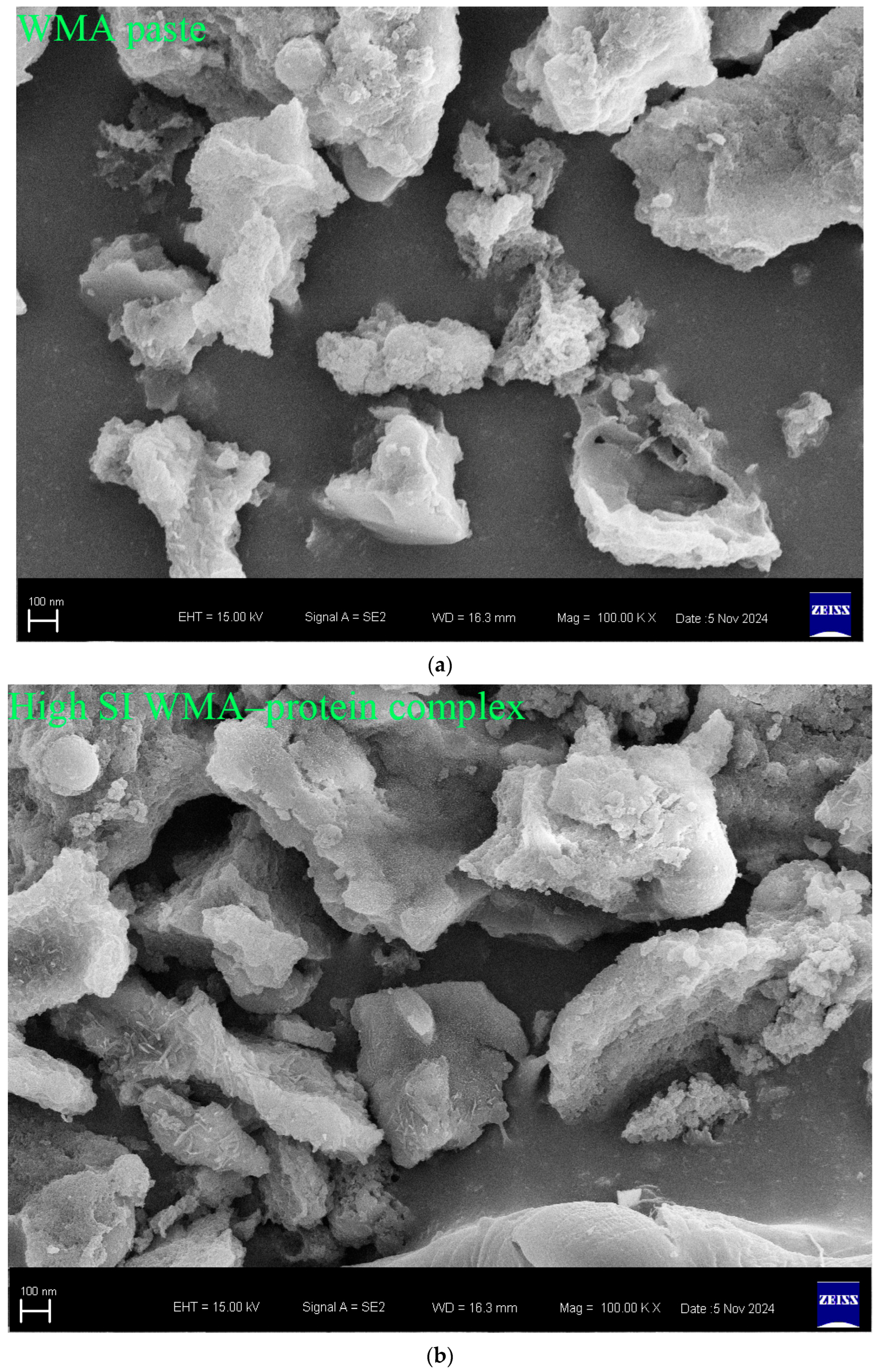 | High-SI WMA–protein complex | 78.49 ± 0.77 b | 4.79 ± 0.04 b | 150 b | 80.01 ± 1.55 b | 2.56 ± 0.04 b | 540 a |