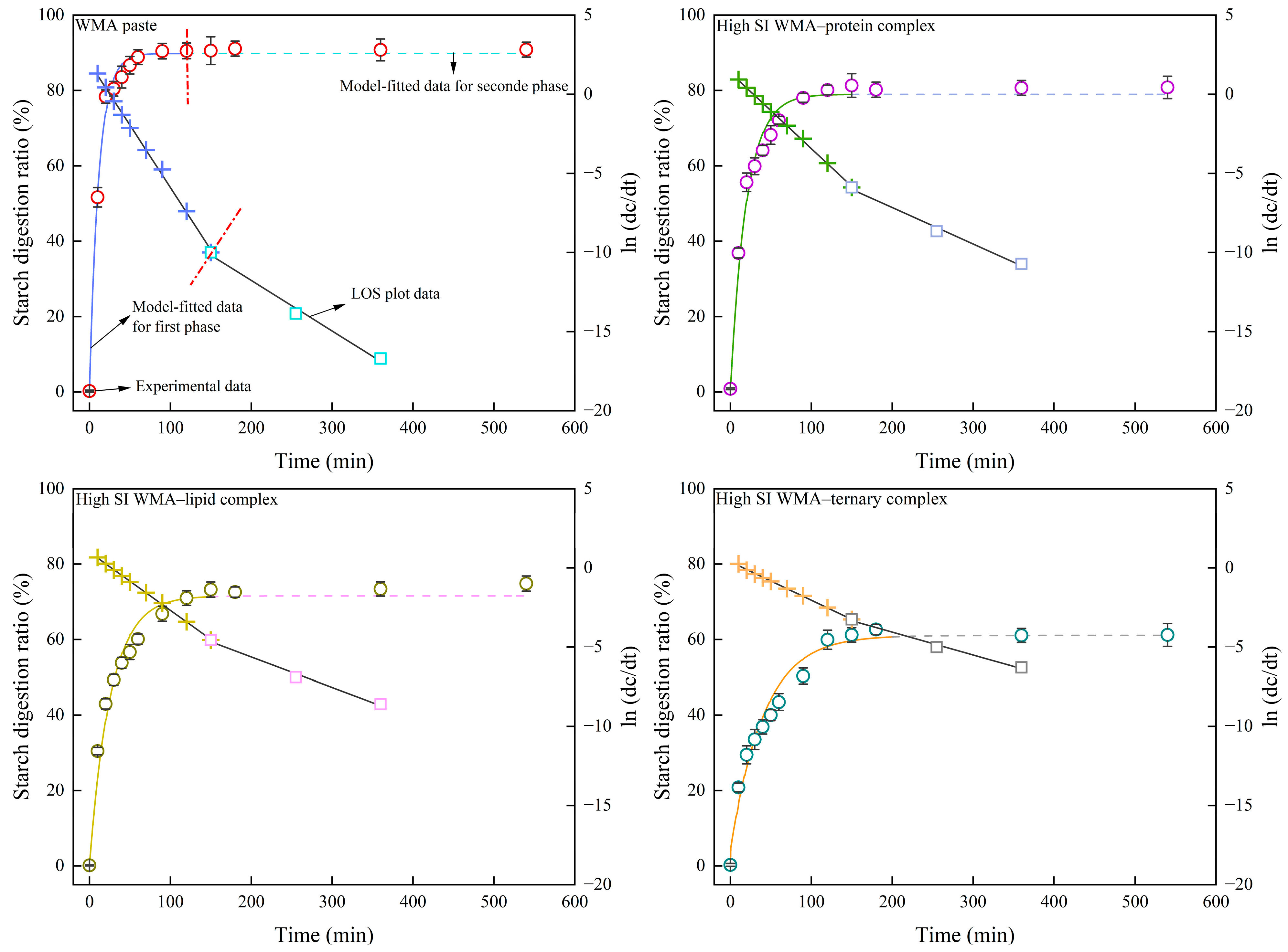 3.6. Investigations of Slow Digestibility Characterization and LOS Kinetics
