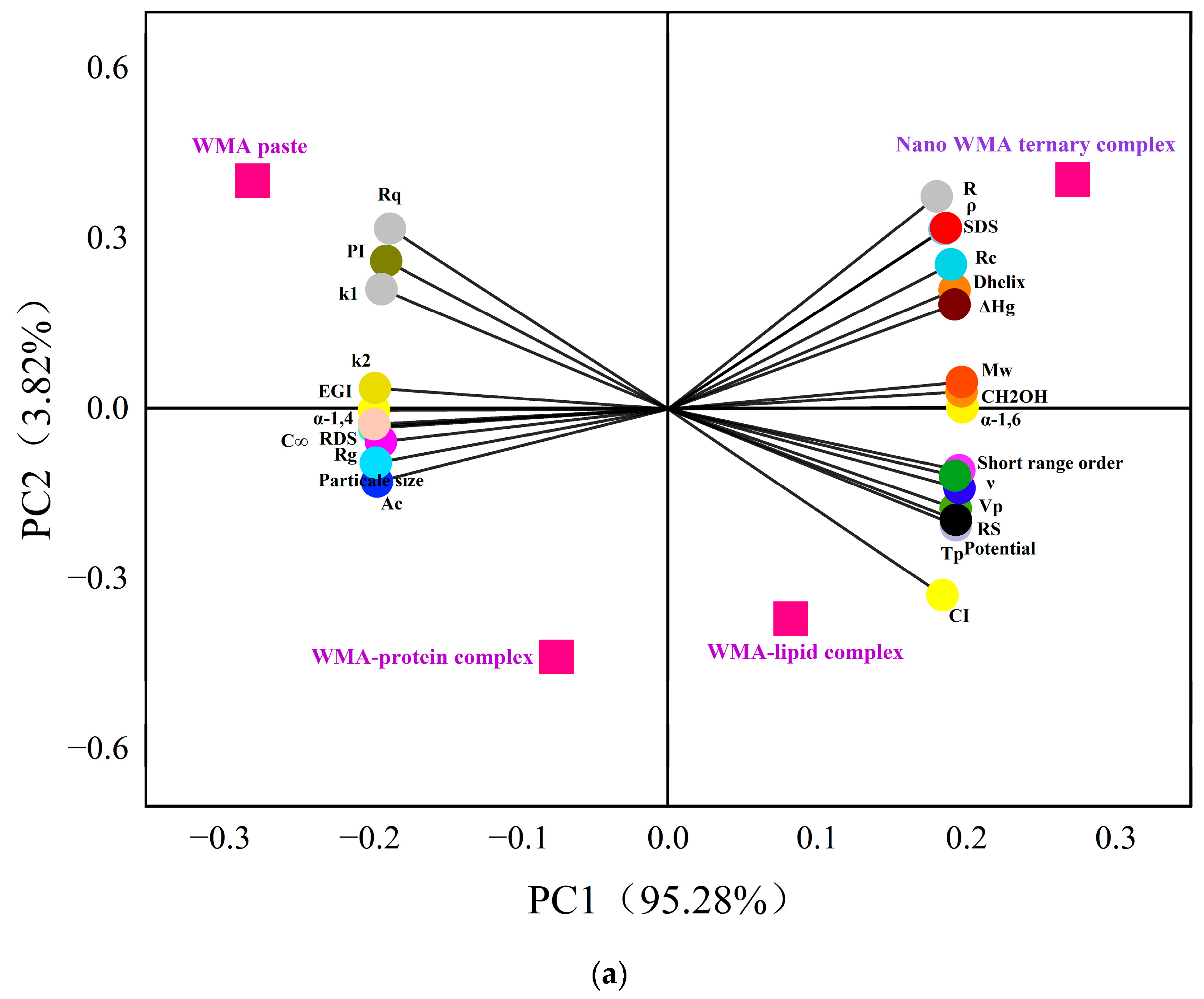 | WMA–protein complex | 9.22 ± 0.07 c | 2.80 ± 0.09 b | 0.56 ± 0.03 c | 0.42 ± 0.10 b | 5.99 ± 0.08 c | 3.98 ± 0.14 c |