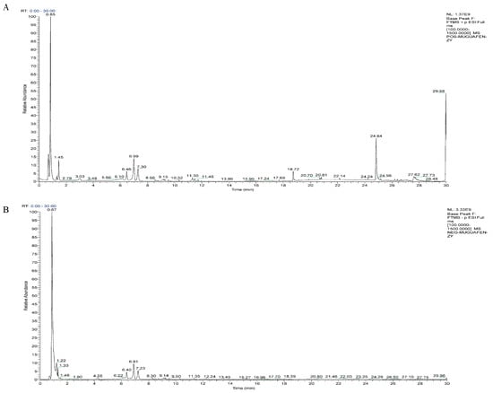 The base peak ion chromatogram of CF detected in positive and negative mode. (A) ESI (+). (B) ESI (−).