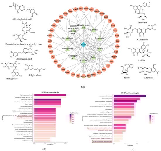 LC-MS analysis of the absorbed constituents identified 12 prototype components, such as androsin, chlorogenic acid, cymaroside, quercitrin, and salicin, along with 12 secondary metabolites (Supplementary Figure S1, Table S8). Notably, these prototype components were consistent with the composition of the CF aqueous extract. Based on their presence in the blood and aqueous extract, these prototype compounds were selected for network pharmacology analysis. They were screened using the SwissTargetPrediction database (probability > 0.12), yielding 10 key components and 39 non-redundant predicted targets. Subsequently, a protein–protein interaction (PPI) network was constructed using the STRING database and visualized in Cytoscape software version 3.8.0, alongside the chemical structures of key components (Figure 3A).