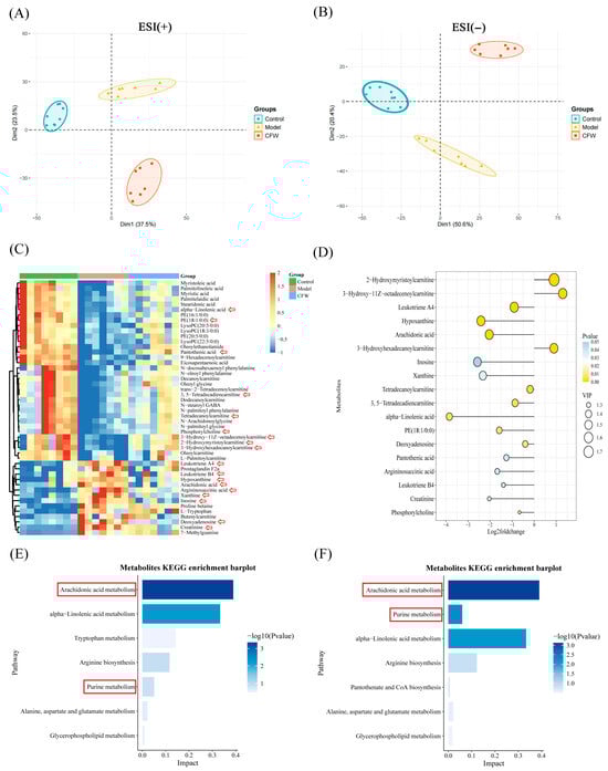 Metabolomics data analysis. (A) Positive ion PCA score plot for each group (n = 7). (B) Negative ion PCA score plot for each group (n = 7). (C) Heatmap of differential metabolites between groups (n = 7). Red arrows mark the metabolites displayed in the lollipop plot. (D) The lollipop plot illustrates the p values, Log2 fold change values, and VIP scores of these metabolites (ranked by VIP value), based on the comparison between the model group and the CF-treated group. In this analysis, a Log2 fold change < 0 indicates that the metabolite level was downregulated after CF treatment, whereas a Log2 fold change > 0 reflects an upregulation in response to CF treatment. (E) Analysis of metabolic pathways in the control and model groups containing differential metabolites. (F) Pathway analysis of different metabolites in the model and CF groups The red arrows denote metabolites exhibiting significant differences. The red box indicates the KEGG pathways related to arachidonic acid and purine metabolism.