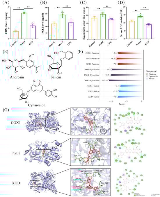 Molecular docking analysis was conducted to explore the potential interactions between the primary blood-entry constituents of CF—androsin, cynaroside, and salicin and three key targets implicated in hyperuricemia: COX-1, PGE2, and XOD. The chemical structures of these compounds are shown in Figure 6E. Docking simulations suggested that all three compounds may exhibit favorable binding affinities toward the selected targets. Notably, cynaroside demonstrated the lowest binding energy values across multiple targets, indicating a potentially stronger predicted interaction (Figure 6F,G). Additionally, Indomethacin and Febuxostat were employed as positive controls targeting COX-1/PGE2 and XOD, respectively (Supplementary Figure S4).