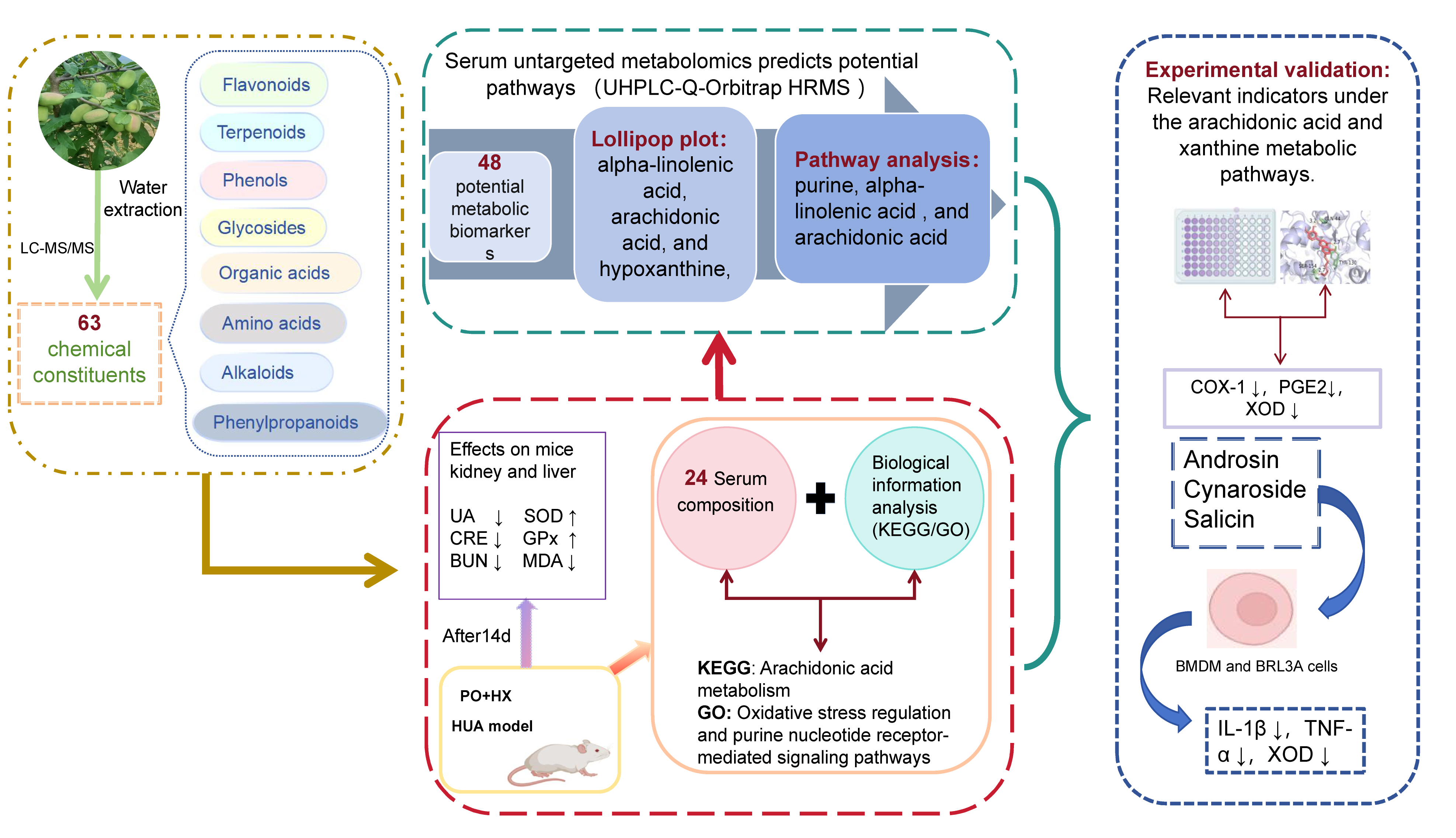 Zhang, M.; Liu, C.; Zhang, Y.; Yuan, Z.; Chen, S.; Zhang, H.; Huang, X.; Chen, L.; Mei, Z.; Ge, Y. Bioactive Components, Untargeted Metabolomics and Bioinformatics of Chaenomeles speciosa Fruit on Uric Acid-Lowering Activity Assessment. Foods 2026, 15, 20. https://doi.org/10.3390/foods15010020