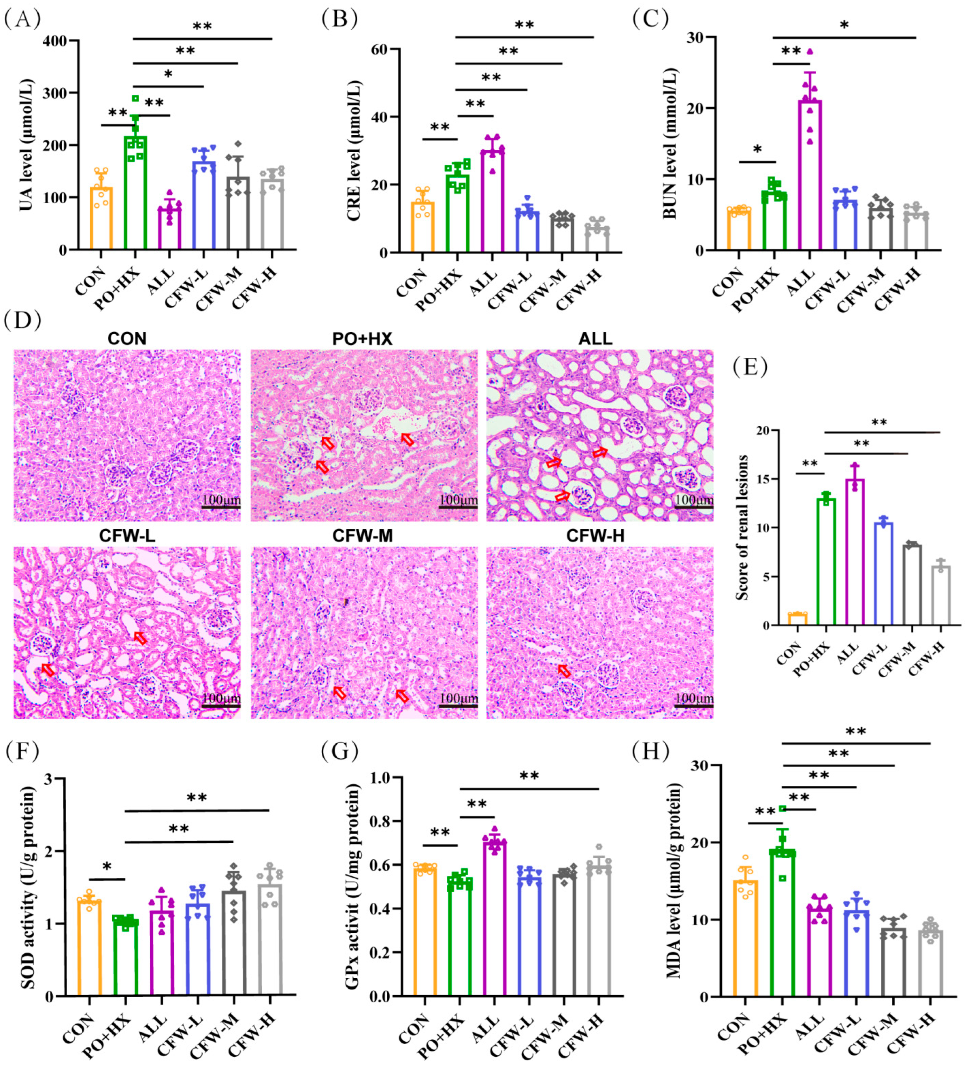 3.2. Effect of CF on Serum UA, CRE, and BUN Levels