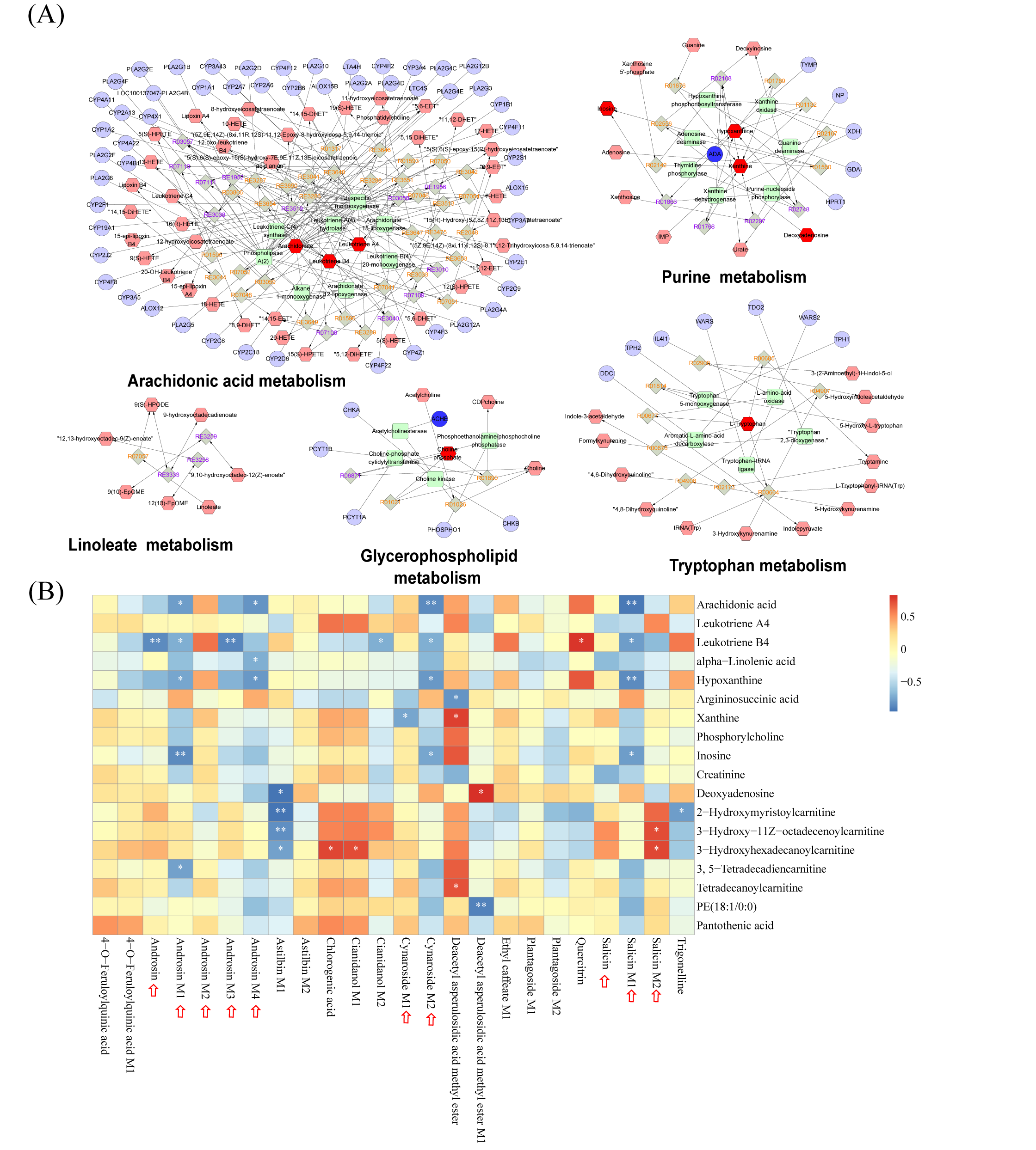 3.7. Integrated Analysis of Metabolic Networks and Blood-Absorbed Constituents-Metabolite Correlations