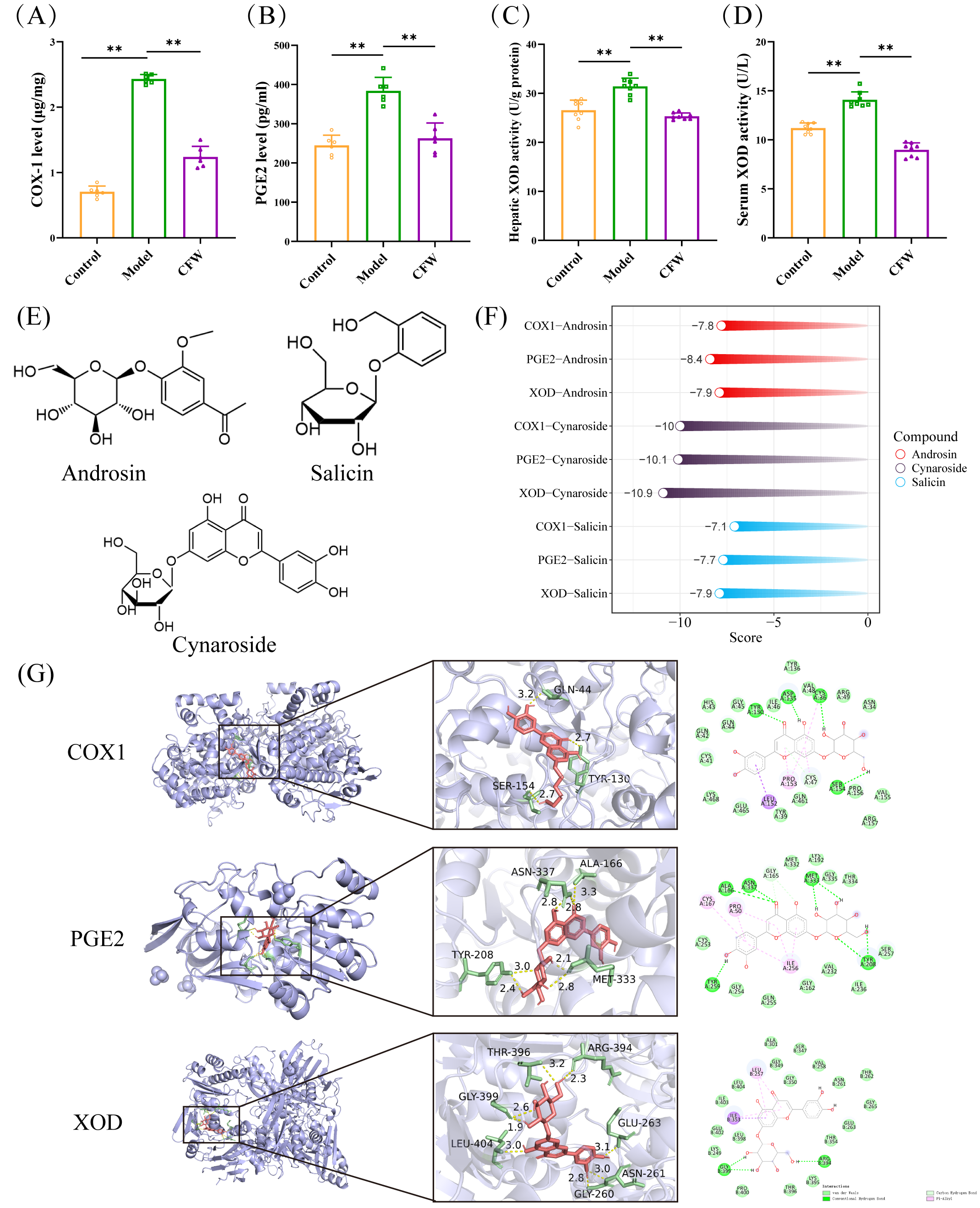 3.8. Molecular Docking of COX-1/PGE2/XOD & In Vivo/In Vitro Validation
