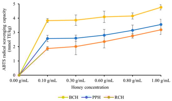 Similar to the DPPH assay, all three A. cerana honey varieties (BCH, PPH, and RCH) demonstrated potent scavenging capabilities against ABTS radicals. As depicted in Figure 2, a clear concentration-dependent enhancement in the ABTS radical scavenging rate was observed across the 0.10–1.00 g/mL range, signifying an increase in antioxidant potential. At each tested concentration, significant differences were noted among the honeys (p < 0.05), with the scavenging potency consistently following the hierarchy of BCH > PPH > RCH. The peak activities were recorded at the maximum concentration of 1.00 g/mL, with values of (4.77 ± 0.18) mmol TE/kg for BCH, (3.56 ± 0.36) mmol TE/kg for PPH, and (3.19 ± 0.34) mmol TE/kg for RCH. The significant differences among honeys (p < 0.05) and the consistency with DPPH results suggest that BCH has a higher capacity for scavenging radicals, which is probably due to the quantity and quality of its phenolic constituents.