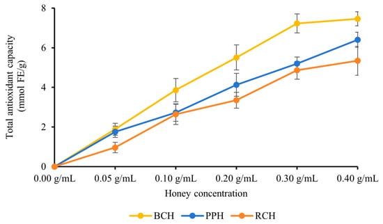 The FRAP of the three A. cerana honey varieties (BCH, PPH, and RCH) was assessed using the FRAP assay over a concentration gradient of 0.05–0.40 g/mL. As shown in Figure 3, all honey samples displayed potent reducing power that intensified in a concentration-dependent manner. A general trend of BCH > PPH > RCH was observed for total antioxidant capacity across most concentrations, with these differences being statistically significant (p < 0.05). The sole exception to this pattern occurred at 0.30 g/mL, where the difference between PPH and RCH was not statistically significant (p > 0.05). At the peak concentration of 0.40 g/mL, the FRAP values reached their maximum, recorded as (9.46 ± 0.36) mmol FE/g for BCH, (6.40 ± 0.38) mmol FE/g for PPH, and (5.34 ± 0.73) mmol FE/g for RCH, with significant differences among all three (p < 0.05). The minor variations observed between PPH and RCH at certain concentrations suggest that the presence of other bioactive components, such as flavonoids, vitamins or enzymes, may result in a synergistic effect.