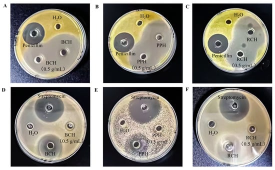 Antibacterial activity of A. cerana honeys against S. aureus and E. coli as demonstrated by inhibition zone assays. (A–C) Inhibition zones produced by undiluted and 0.5 g/mL solutions of BCH, PPH, and RCH against S. aureus. (D–F) Corresponding inhibition zones against E. coli. For each assay, sterile distilled water was used as the negative control, with penicillin and streptomycin serving as the respective positive controls.