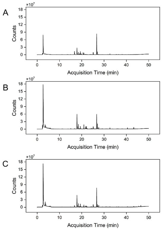TICs of volatile components in three honey varieties. (A) BCH Sample, (B) PPH Sample, (C) RCH Sample.