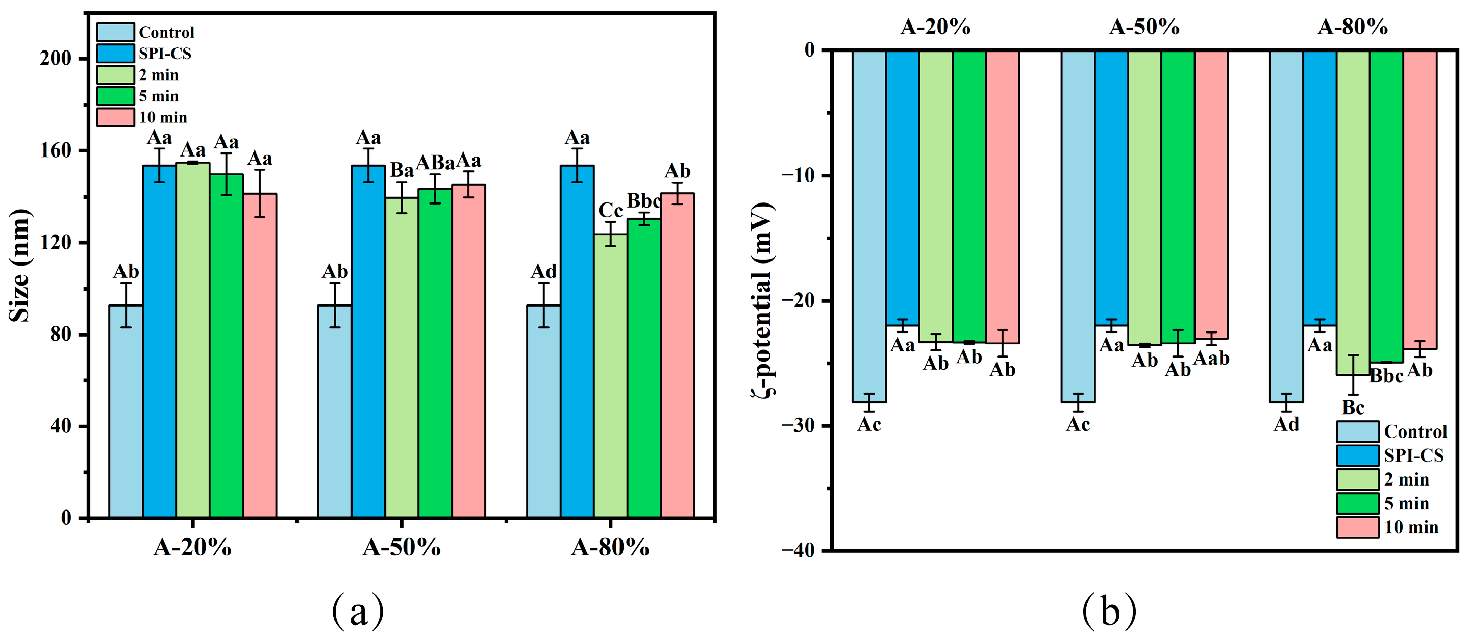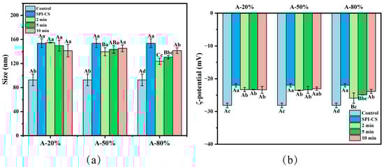 Effect of different ultrasound amplitude and ultrasound time on the particle size (a) and ζ-potential (b) of SPI–CS. A-20%, A-50%, A-80%: SPI–CS treated by 20%/50%/80% ultrasound amplitude at different duration times (2 min, 5 min, 10 min). Values with different letters indicate significant differences (p < 0.05), with uppercase letters representing differences between groups and lowercase letters representing differences within groups. Each legend clearly states that the data represent mean ± SE (n = 3).