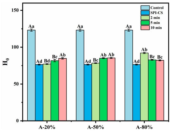 The index of H0 is often used to assess the content of the hydrophobic groups exposed on the outside of a protein as a very important structural peculiarity of it. As illustrated in Figure 2, the presence of CS in tandem with SPI in the studied systems caused a significant decrease (p < 0.05) in their H0 values by comparison with H0 of the control (p < 0.05) due to the fact that the hydrophobic sites on the protein (SPI) surface were covered by the polysaccharide (CS) [20]. In addition, the ultrasound treatment significantly improved the H0 of SPI–CS (p < 0.05). Similar results concerning H0 for soy protein isolate–citrus pectin electrostatic complexes under ultrasound treatment [21] and H0 for whey protein isolate–chitosan/chitooligosaccharide complex under the treatment of ultrasound [22] were also reported. This phenomenon was attributed to the physico-mechanical effects generated during ultrasound treatment, whereby a mass transfer process was induced, and the hydrophobic moieties initially buried in the non-denatured protein were transferred to the protein surface as a result of unfolding [22]. In addition, the H0 values for A-20% and A-50% exhibited an increasing ultrasound time-dependence, while the H0 for A-80% showed an opposite trend. These findings were in accordance with what Wang et al. [15] reported for the rice bran protein–chlorogenic acid complex: H0 follows an increasing ultrasonication time course under lower ultrasound amplitude and an opposite trend under higher ultrasound amplitude. Practically, such an in-excess ultrasonication could cause particles to associate via hydrophobic regions exposed to the aqueous environment, leading to aggregates superficially less hydrophobic (or even hydrophilic) as suggested by Zhao et al. [23].