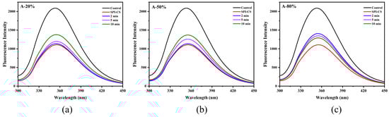 Effect of different ultrasound amplitudes and ultrasound times on the fluorescence spectra of SPI–CS (A-20 % (a), A-50 % (b), A-80 % (c)).
