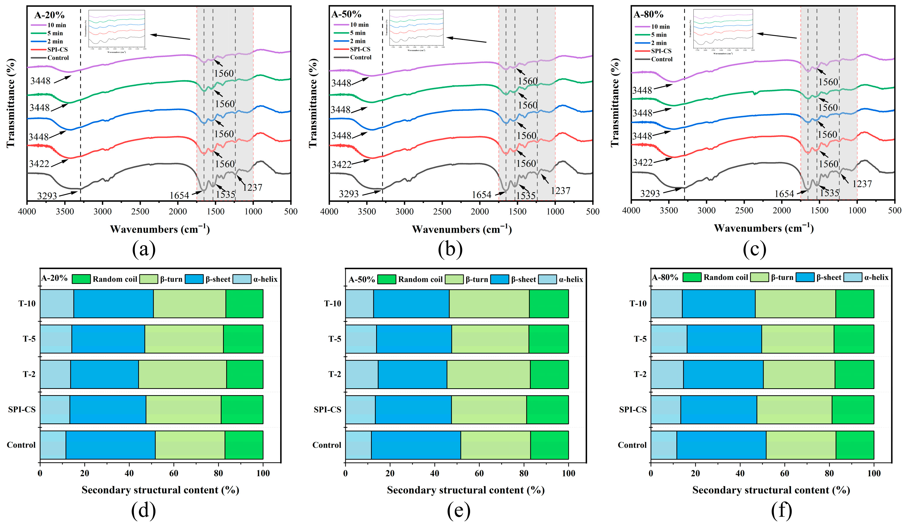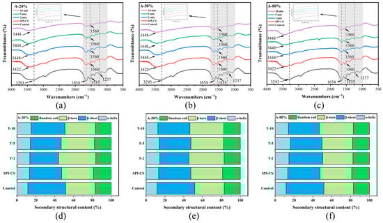 FTIR spectra (a–c) of SPI and SPI–CS complexes and content of different types of secondary structures (d–f) of the protein component for the studied systems under specified working parameters.