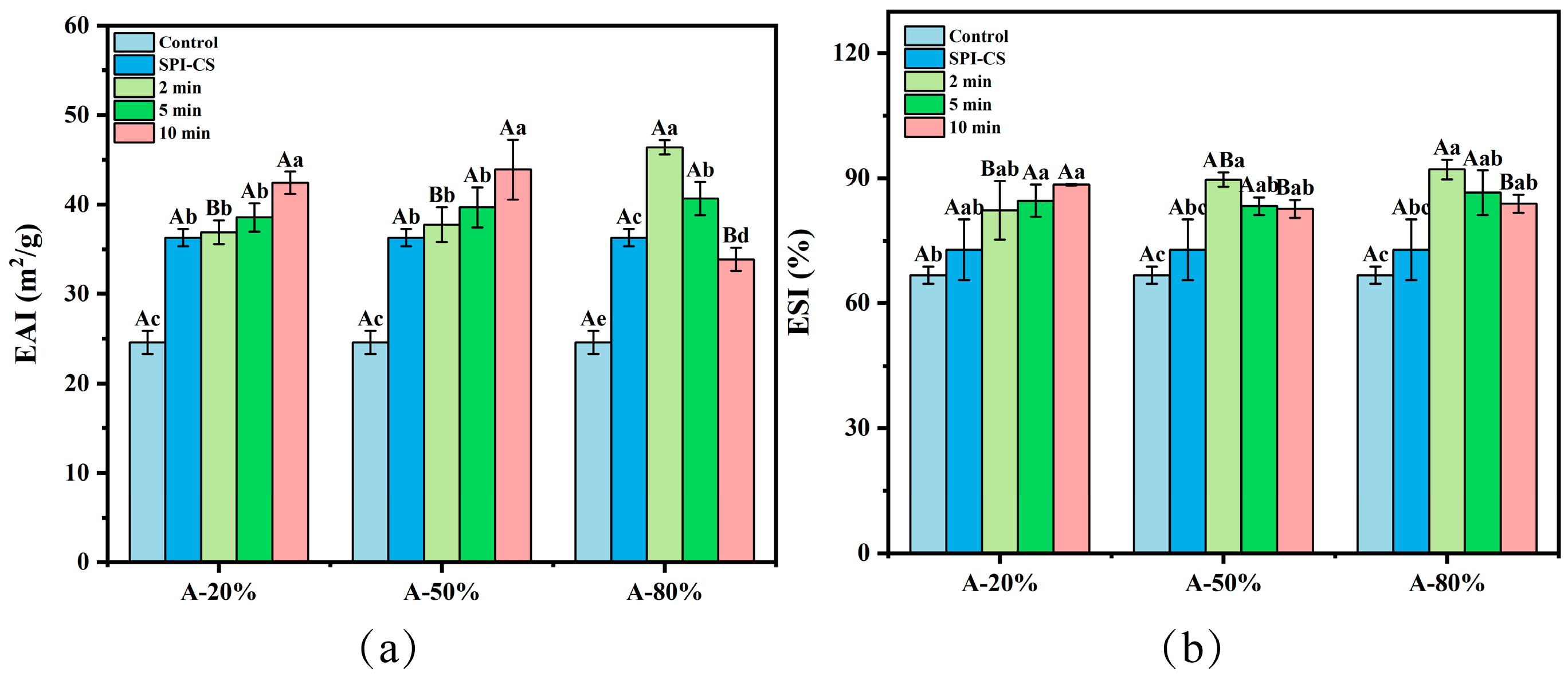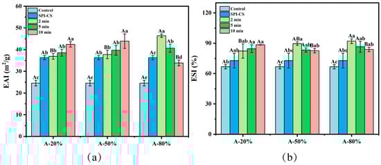Effect of different ultrasound amplitude and ultrasound time on the EAI (a) and ESI (b) of SPI–CS. Values with different letters indicate significant differences (p < 0.05), with uppercase letters representing differences between groups and lowercase letters representing differences within groups.