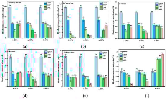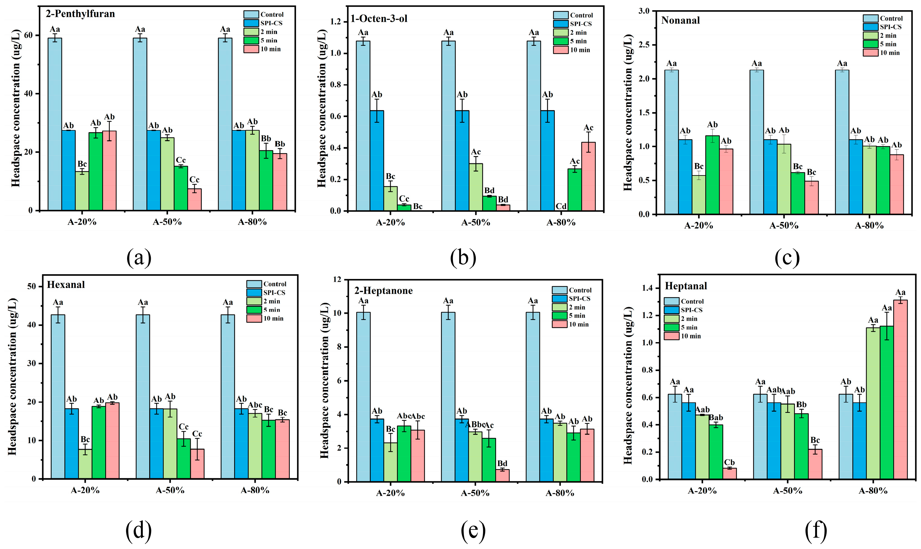 Identification and quantification of representative beany-flavor compounds in SPI–CS using HS-SPME-GC-MS. 2-Penthylfuran (a), 1-octen-3-ol (b), nonanal (c), hexanal (d), 2-heptanone (e), and heptanal (f). Values with different letters indicate significant differences (p < 0.05), with uppercase letters representing differences between groups and lowercase letters representing differences within groups.