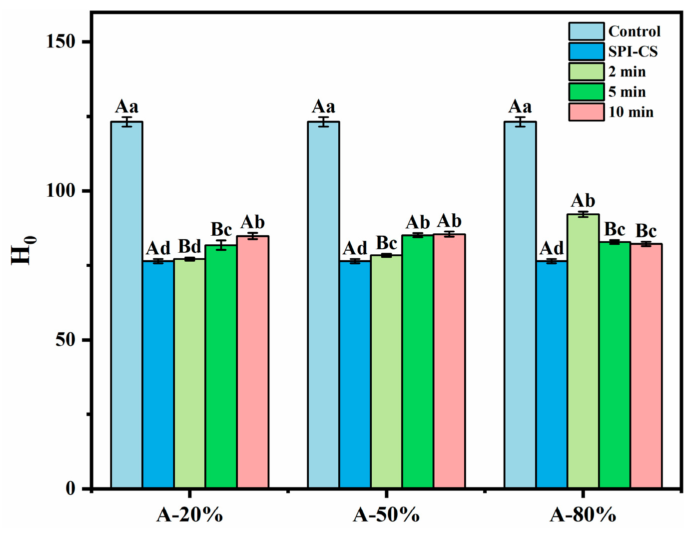 Effect of different ultrasound amplitudes and ultrasound times on the surface hydrophobicity of SPI–CS. Values with different letters indicate statistically significant differences (p < 0.05), with uppercase letters representing differences between groups and lowercase letters representing differences within groups.