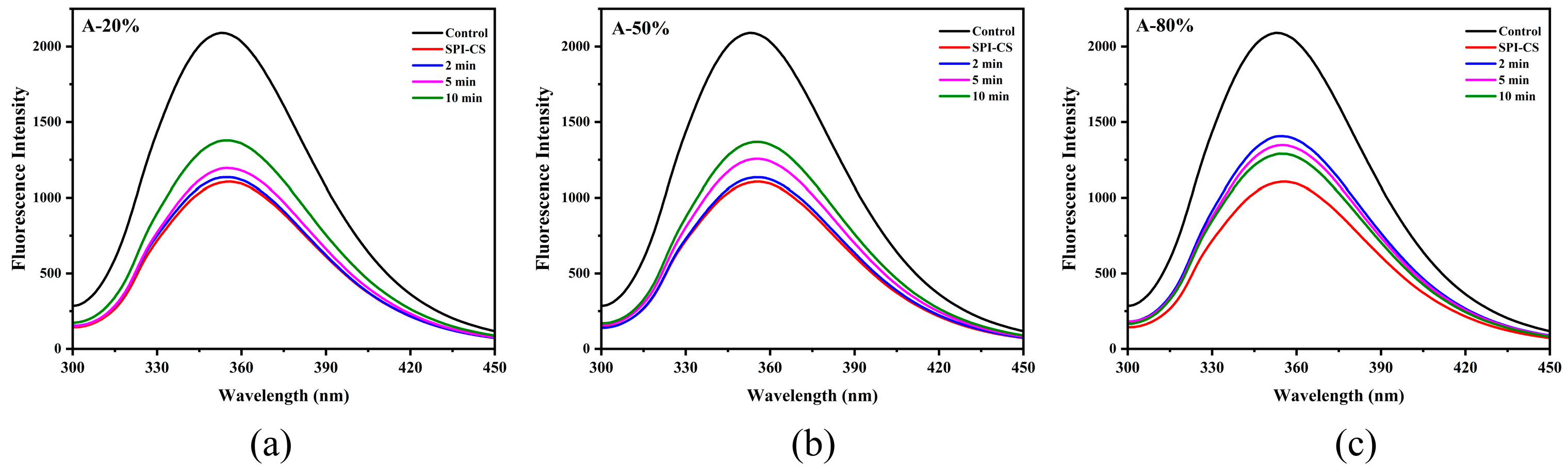 Intrinsic tryptophan fluorescence is highly sensitive to the polarity and dynamics of the local microenvironment of tryptophan residues in proteins and is therefore widely used to monitor changes in protein tertiary structure. Upon combining with CS, the fluorescence intensity of SPI markedly decreased (Figure 3), suggesting that tryptophan residues were transferred from a more polar to a more hydrophobic environment [24]. Ultrasound treatment subsequently increased the fluorescence intensity of SPI–CS, indicating partial alteration of the tryptophan environment under sonication. Similar results of fluorescence spectrum appeared in the previous work for sodium caseinate–pectin complex under ultrasound treatment [17] and whey protein isolate–chitosan/chitooligosaccharide complex under the ultrasound treatment [22]. Additionally, the fluorescence spectra intensity of A-20% and A-50% showed an upward trend, while the fluorescence spectra intensity of A-80% showed a downward trend, which was consistent with the aforementioned description regarding surface hydrophobicity.