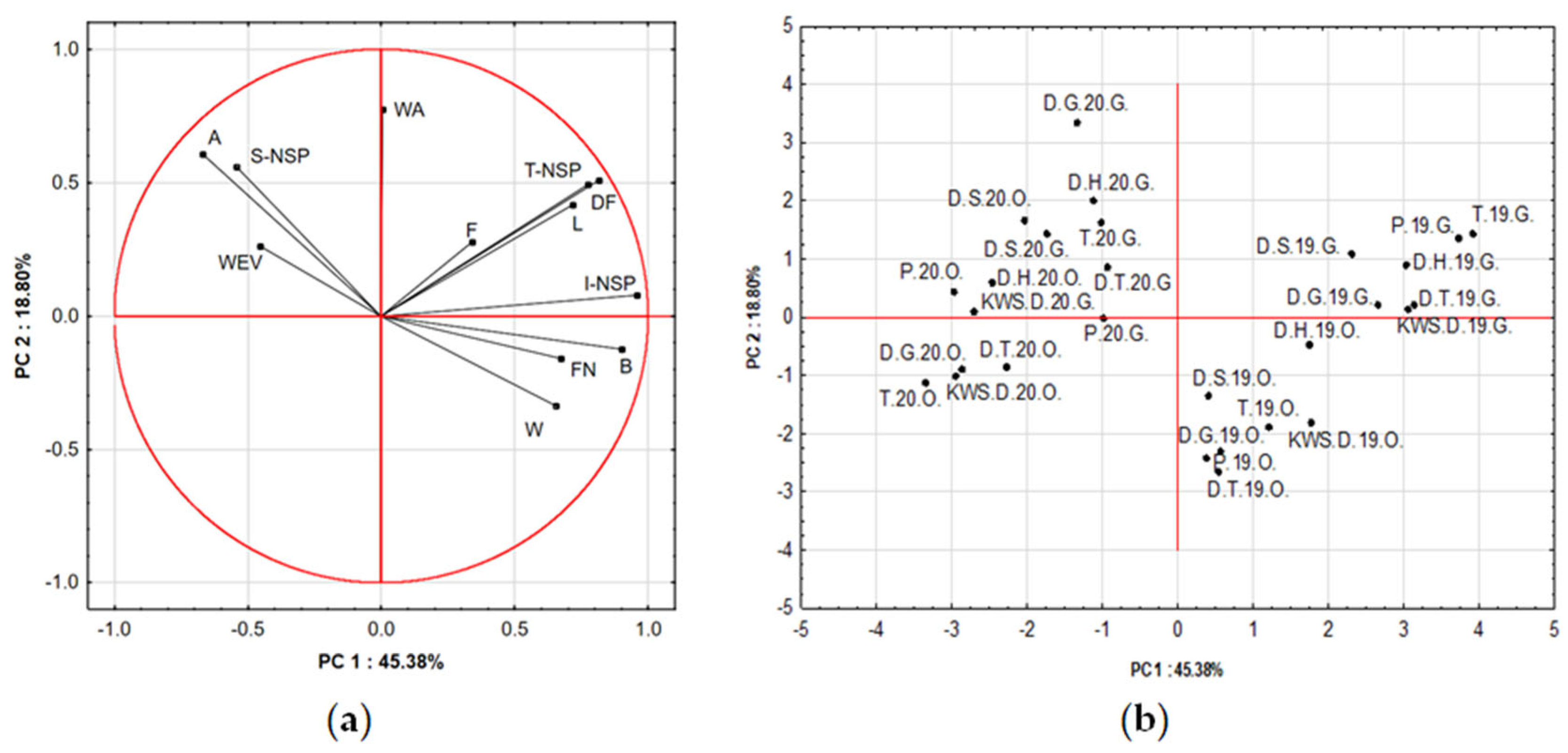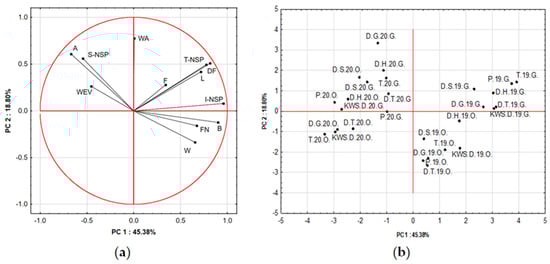 PCA was performed to evaluate the relationships among the analyzed quality parameters and to identify the main factors differentiating the samples. The first two principal components (PC1 and PC2) explained a total of 64.18% of the overall data variance, with PC1 accounting for 45.38% and PC2 for 18.80% (Figure 1). The loading plot (Figure 1a) revealed a clear grouping of variables into two main areas. PC1 was strongly and positively correlated with the total non-starch polysaccharides content (T-NSP), their insoluble fractions (I-NSP), dietary fiber content (DF), falling number (FN), and protein content (B) and negatively with ash content (A), water extract viscosity (WEV), and soluble non-starch polysaccharide (S-NSP) content. These variables contributed the most to the differentiation among samples. In contrast, flour water absorption (WA) and ash content were more strongly associated with PC2, indicating their smaller but still significant role in sample differentiation. A strong positive correlation was observed between T-NSP and S-NSP, as well as I-NSP and DF, confirming their shared contribution to the formation of the non-digestible carbohydrate fraction. The close alignment of the T-NSP, DF, and FN vectors indicates that samples with higher fiber content were also characterized by higher FN values, which may be associated with lower α-amylase activity. The ash content (A) and moisture content (W) parameters were positively related to the DF, indicating that samples with higher fiber content also contained more mineral substances and exhibited higher moisture levels. The score plot (Figure 1b) showed a clear separation of the analyzed samples in the factor space, confirming the effectiveness of PCA in distinguishing the studied groups. Samples from 2020 were mostly situated on the left side of the plot (negative PC1 values), while those from 2019 were positioned on the right (positive PC1 values). This separation confirms that the harvest year has a strong influence on measured quality traits, including fiber content, protein, and falling number.