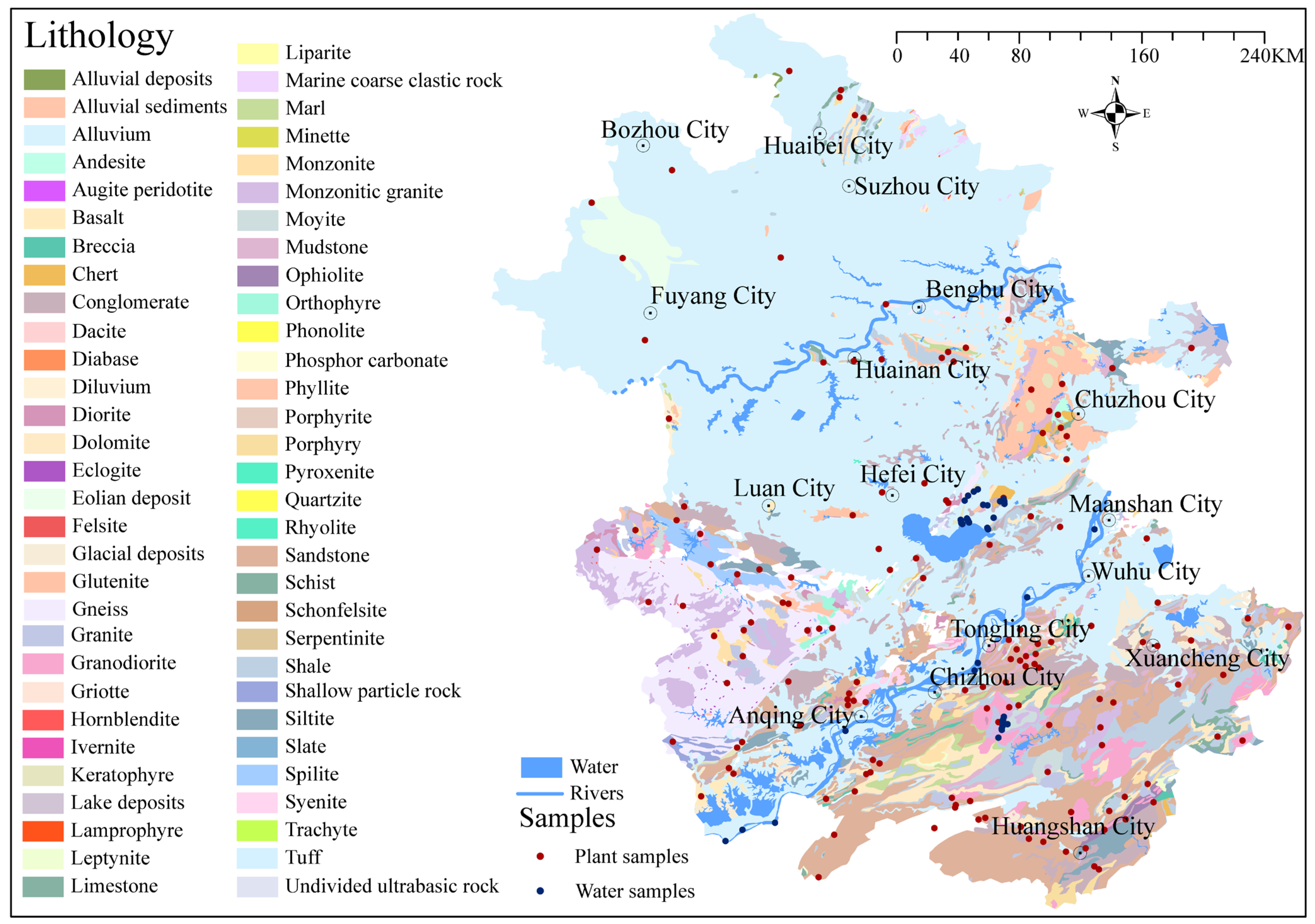 | Anqing City | Alluvium, Diorite, Gneiss, Granite, Monzonite, Sandstone | 30.506 N, 117.038 E | 0.7073 | 0.7120 | 0.7096 ± 0.001 (n = 22) |