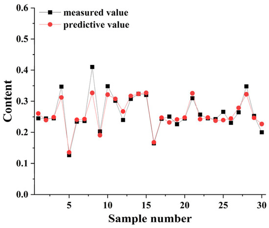 2 = 0.8579, RMSE = 0.0216, RPD = 2.6978. The predicted vs. measured values for this model are shown in