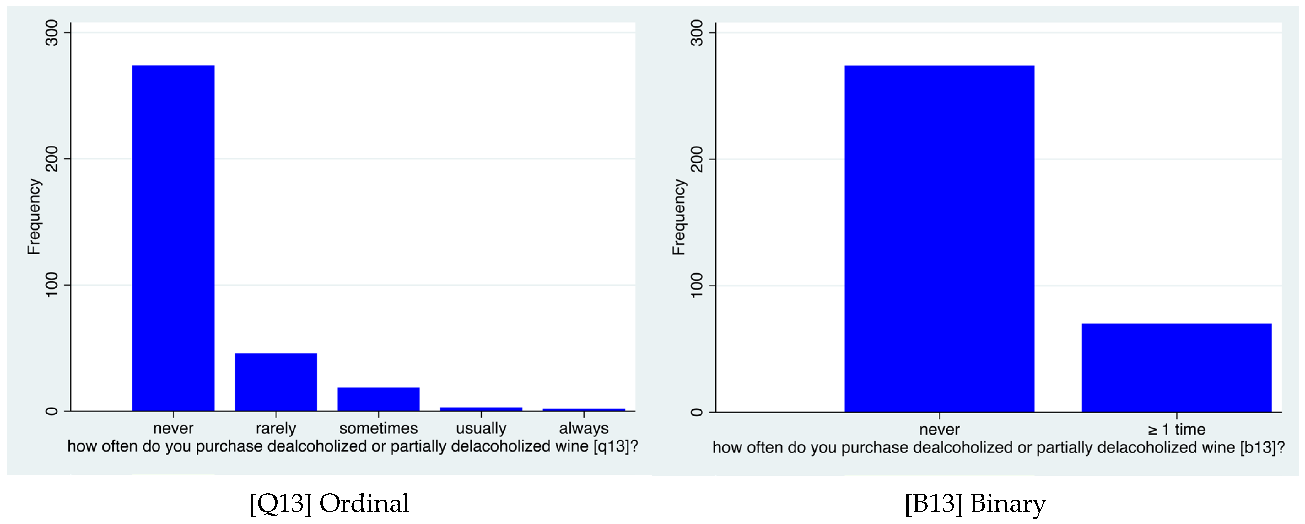 - Stasi, A.; Bimbo, F.; Viscecchia, R.; Seccia, A. Italian consumers׳ preferences regarding dealcoholized wine, information and price. Wine Econ. Policy 2014, 3, 54–61. [Google Scholar] [CrossRef]