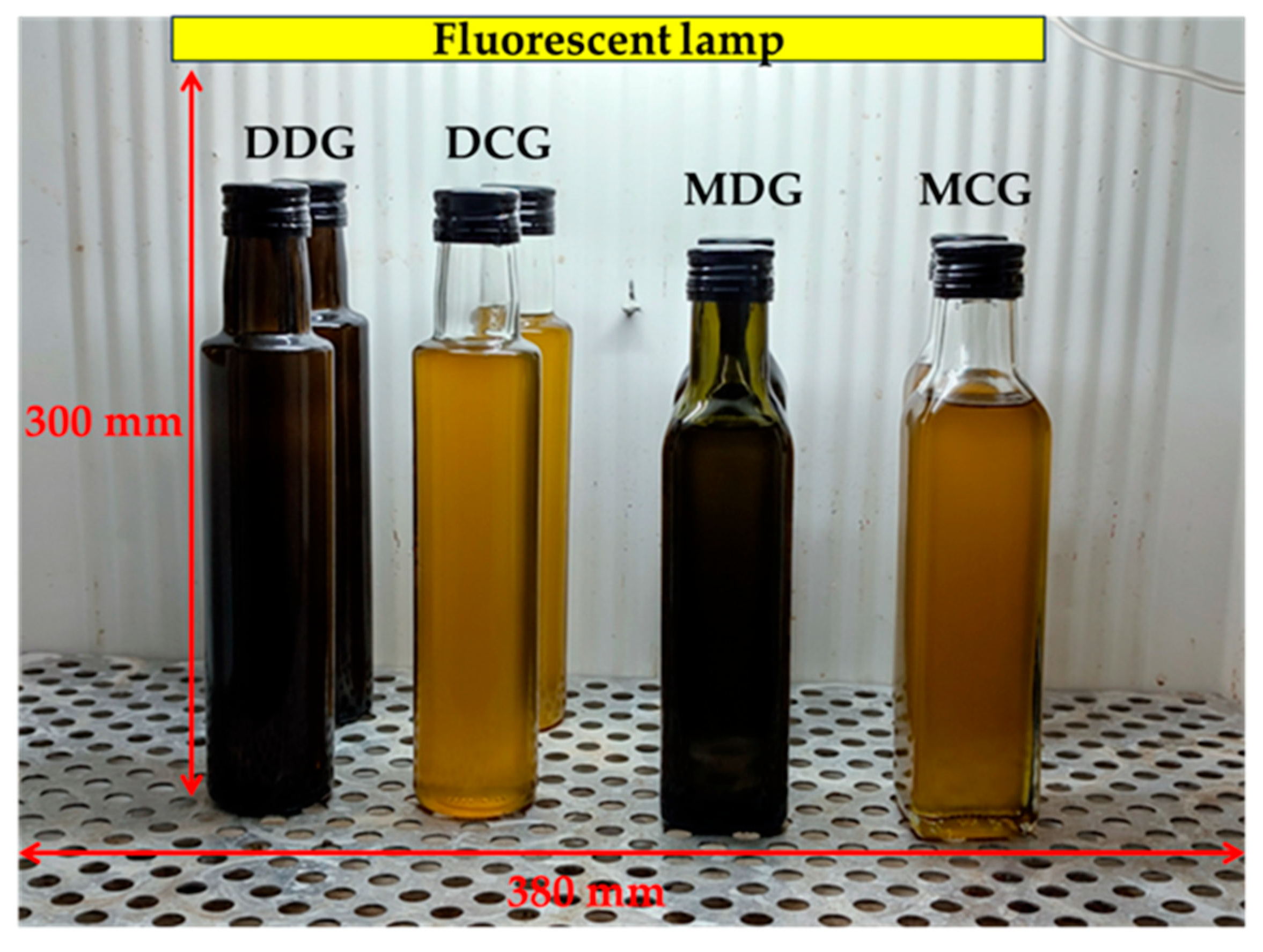 - Kishimoto, N. Influence of Exposure to Sunlight on the Oxidative Deterioration of Extra Virgin Olive Oil during Storage in Glass Bottles. Food Sci. Technol. Res. 2019, 25, 539–544. [Google Scholar] [CrossRef]