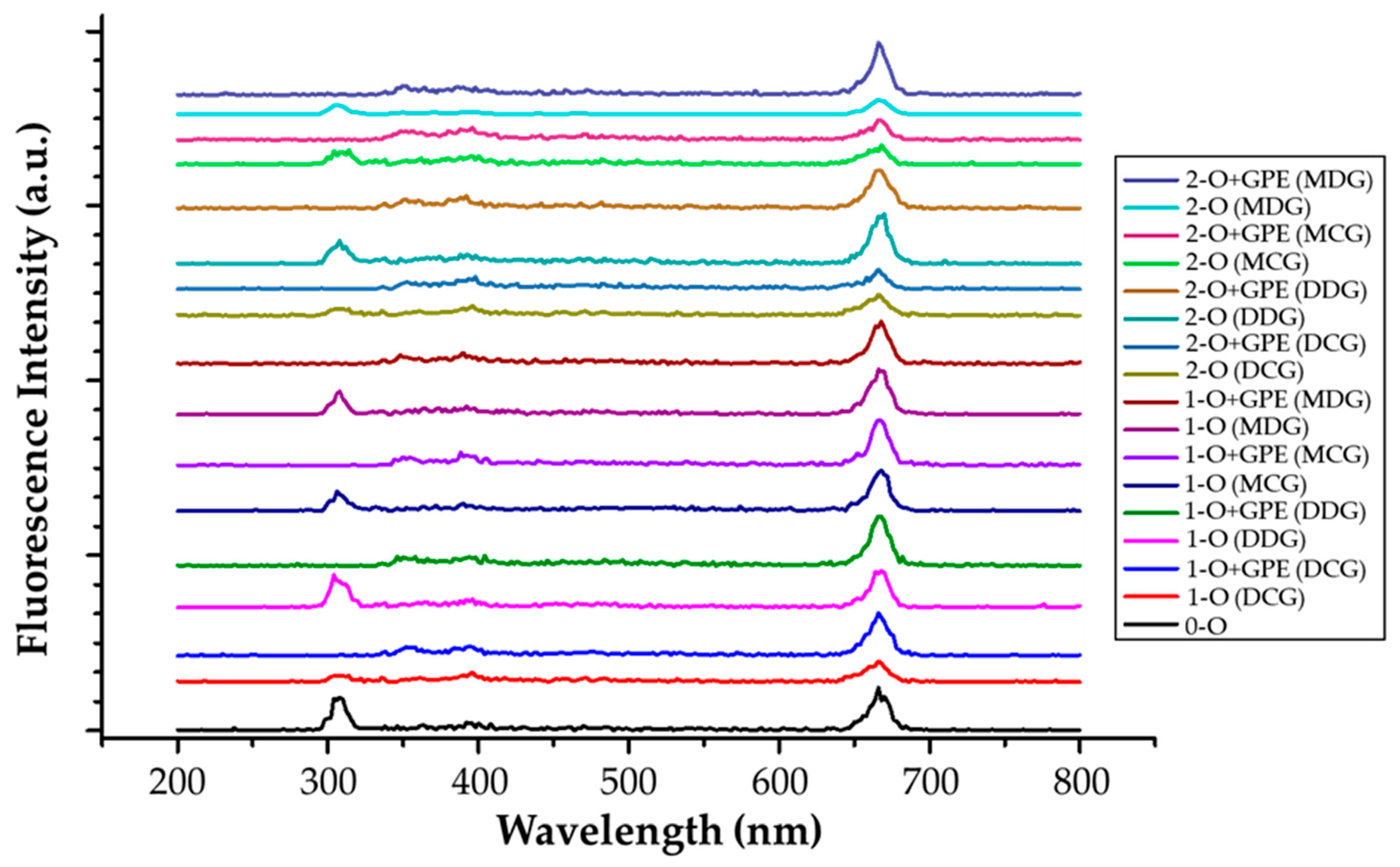 - Lopes, C.R.B.; Courrol, L.C. Evaluation of Steady-State and Time-Resolved Fluorescence Spectroscopy as a Method for Assessing the Impact of Photo-Oxidation on Refined Soybean Oils. Foods 2023, 12, 1862. [Google Scholar] [CrossRef]