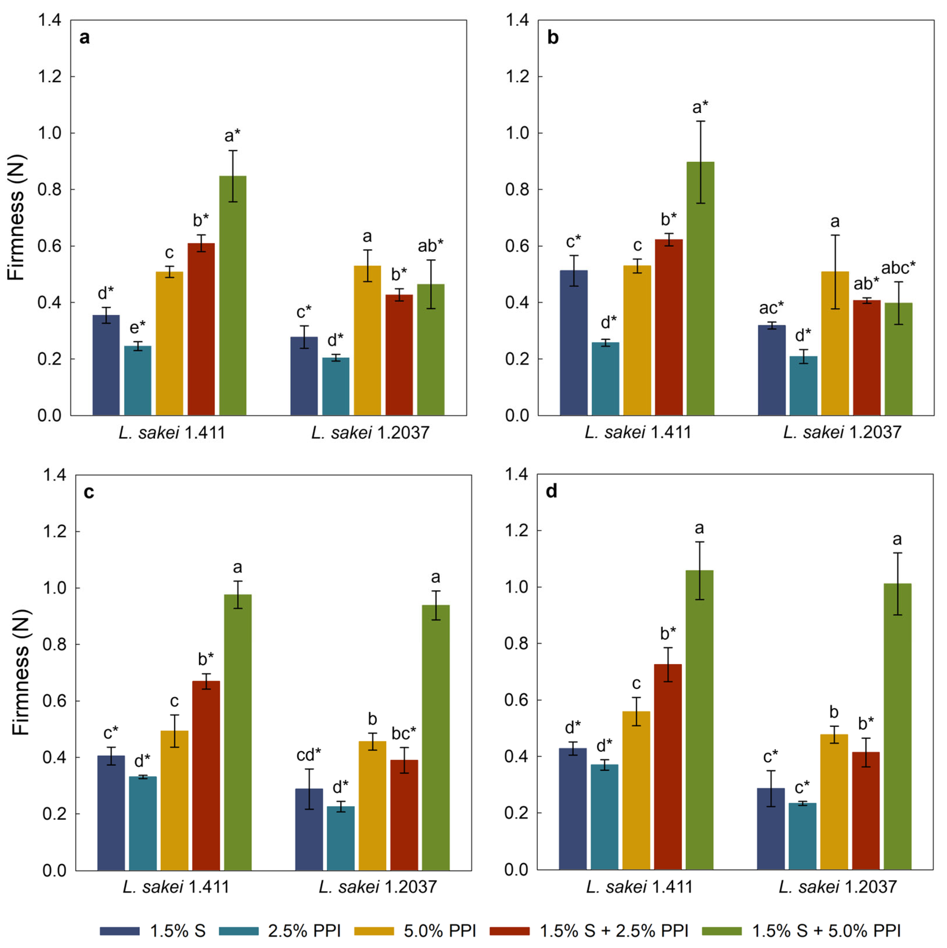 | L. sakei 1.411 | 2.5% w/w | No added S/PPI | 6.03 ± 0.02 | 4.57 ± 0.02 | 4.46 ± 0.03 * | 4.36 ± 0.01 * |