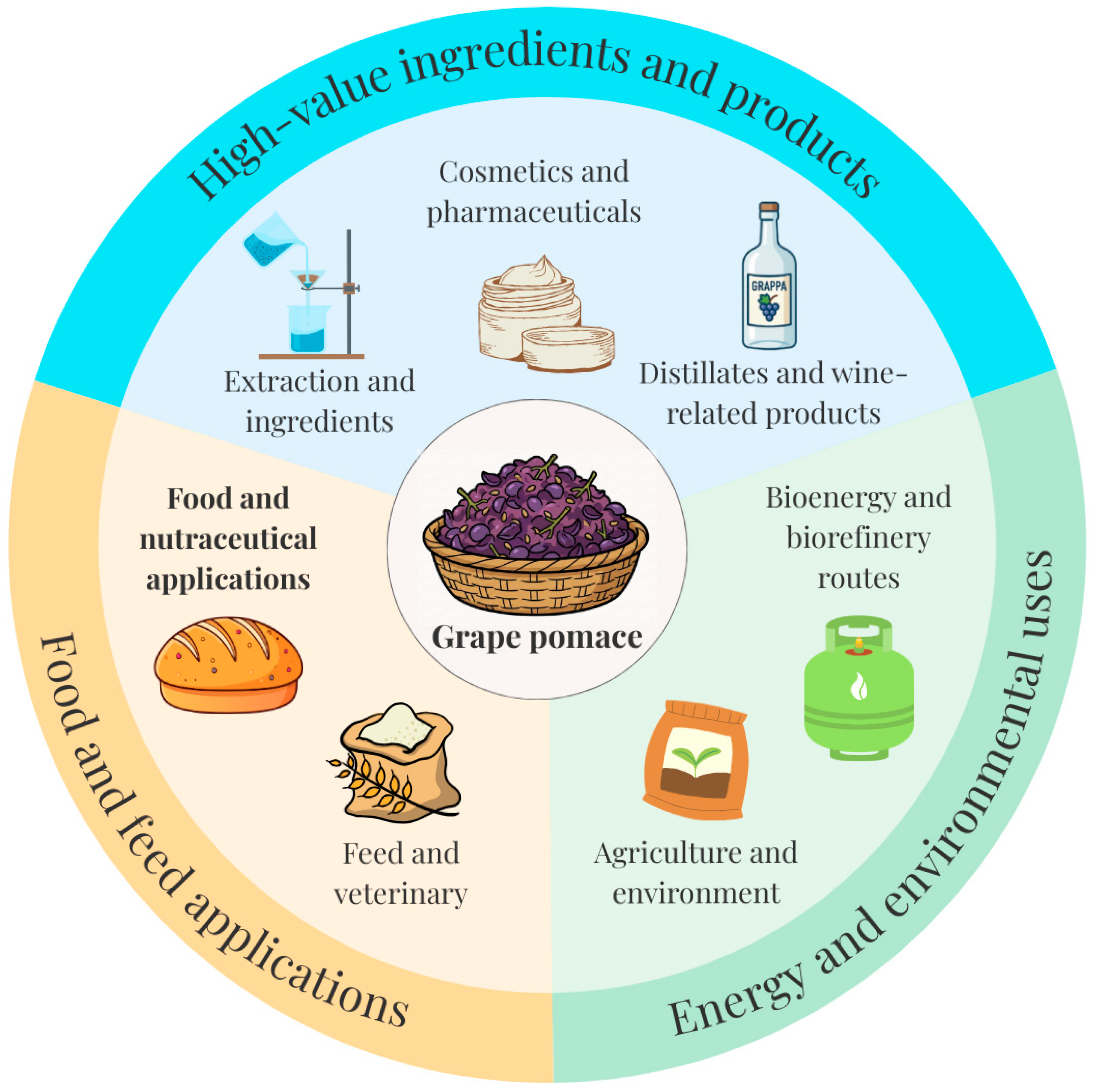 - Caponio, G.R.; Minervini, F.; Tamma, G.; Gambacorta, G.; De Angelis, M. Promising Application of Grape Pomace and Its Agri-Food Valorization: Source of Bioactive Molecules with Beneficial Effects. Sustainability 2023, 15, 9075. [Google Scholar] [CrossRef]