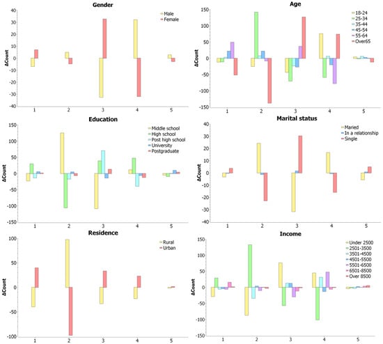 Individuals with middle school education were concentrated in the disagree category (+125.1), indicating a comparatively low inclination toward viewing food reserves as necessary. High-school graduates exhibited a more diffuse pattern, with elevated frequencies in both agree (+47.1) and strongly disagree (+29.8), alongside a substantial deficit in disagree (−106.4), indicating a less uniform stance within this group (Figure 3). University and postgraduate respondents showed only minor deviations across categories, a pattern suggestive of more differentiated, but not polarized, perceptions of food security at higher educational levels.