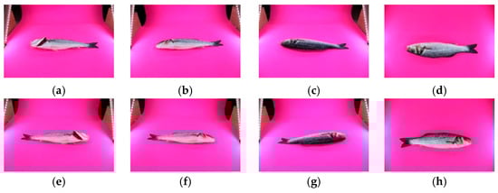 Example image dataset of a single fish captured from multiple viewpoints: (a) left-side angled view with gills open, (b) left-side angled view with gills closed, (c) left-side angled rear view, (d) top view of the left side, (e) right-side angled view with gills open, (f) right-side angled view with gills closed, (g) right-side angled rear view, and (h) top view of the right side of the fish.