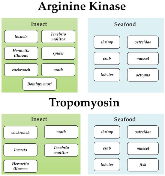 Distribution of allergenic proteins arginine kinase and tropomyosin in insect and seafood sources. The upper figure shows arginine kinase present in various insects and seafood. The lower figure displays tropomyosin in different insects and seafood products.