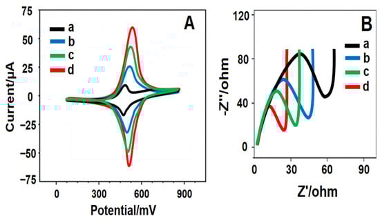 Figure 3. (A) CV curves and (B) EIS responses at (a) bare GCE, (b) BN/GCE, (c) Y2O3@BN/GCE, (d) Pd/Y2O3@BN/GCE (Potential scan rate: 100 mV s−1).