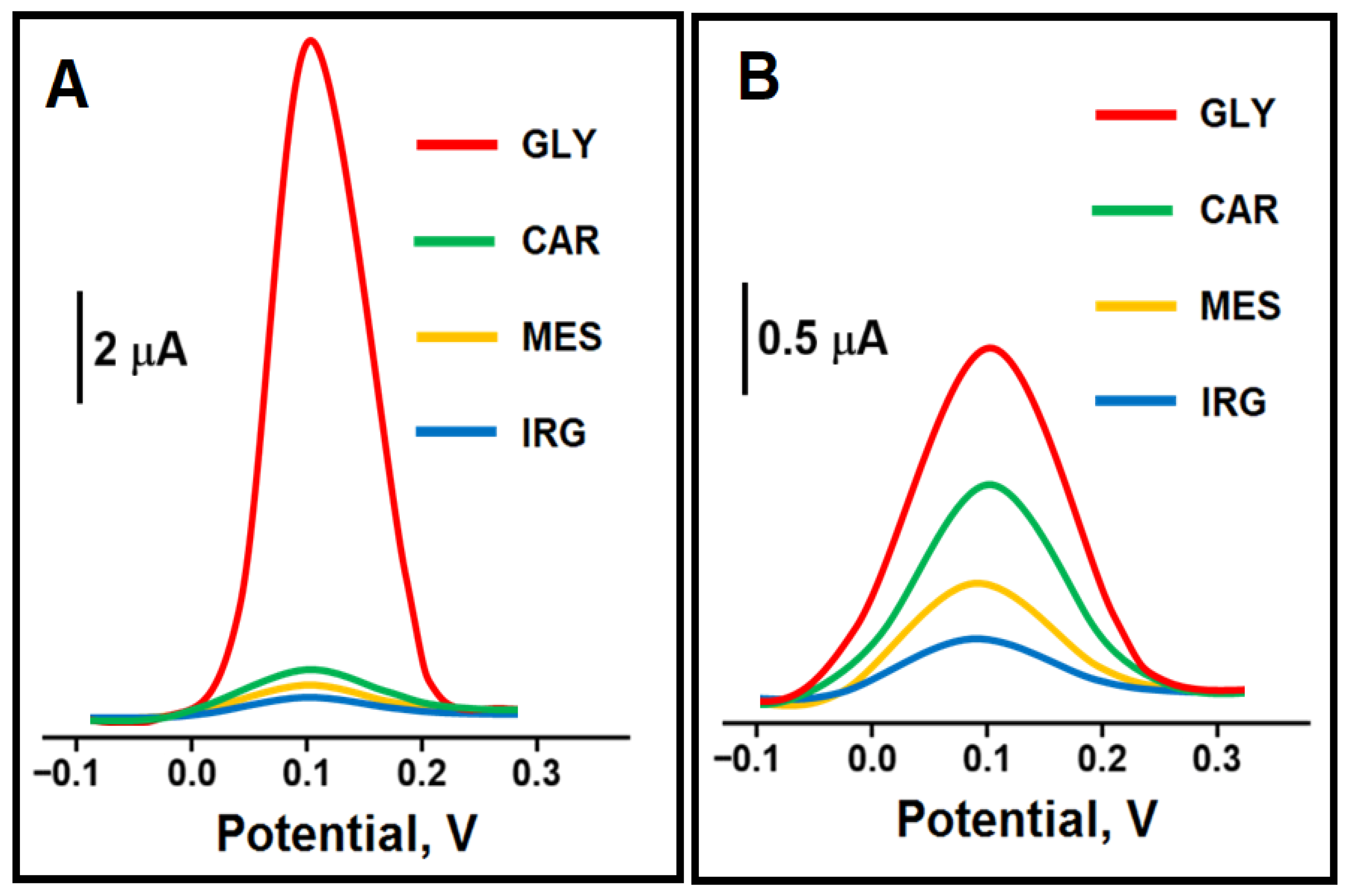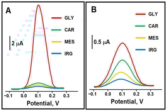 Figure 6. SWVs of (A) MIP/Pd/Y2O3@BN/GCE and (B) NIP/Pd/Y2O3@BN/GCE in 10.0 nmol L−1 GLY, 100.0 nmol L−1 CAR, 100.0 nmol L−1 MES and 100.0 nmol L−1 IRG in 0.1 mol L−1 PBS (pH 5.0) (frequency of 50 Hz, pulse amplitude of 20 mV, scan increment of 3 mV for SWV measurements).