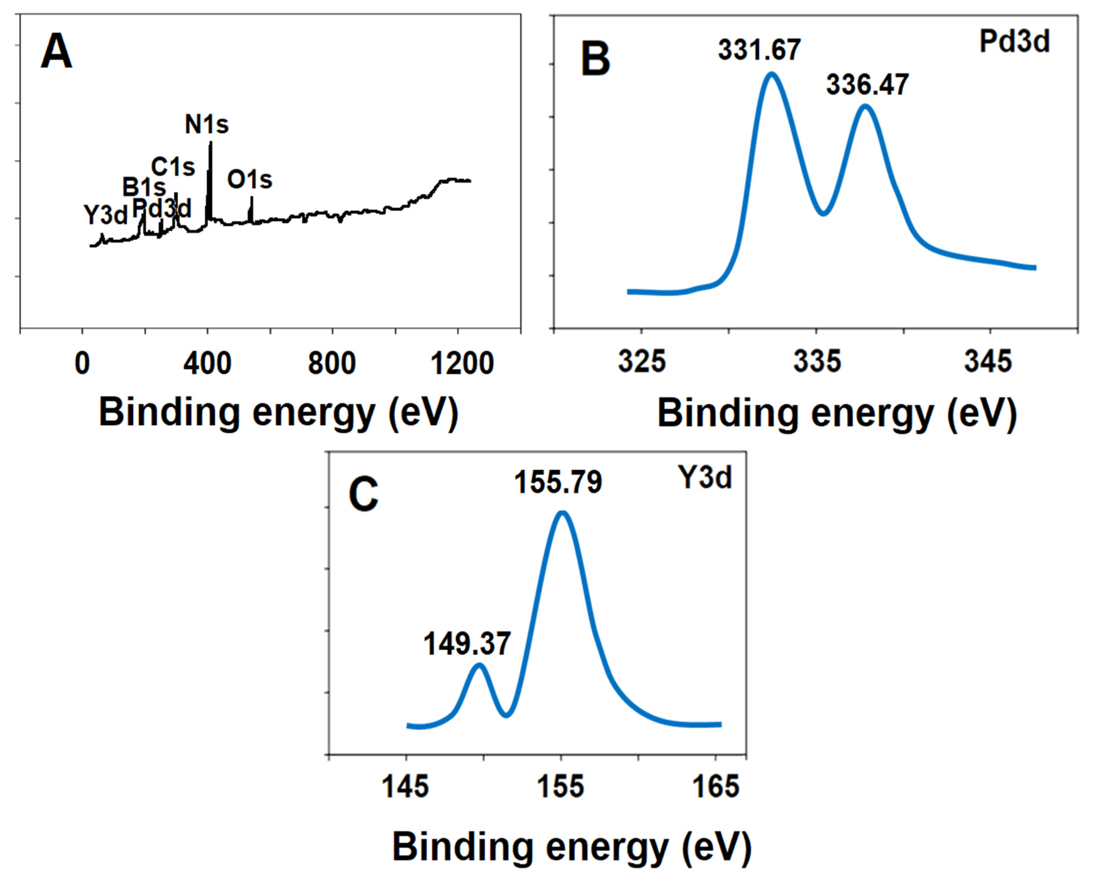 XPS measurements of Pd/Y2O3@BN nanocomposite were investigated for the elemental analysis of the nanocomposite. According to Figure 2A, the presence of boron, nitrogen, carbon, oxygen, palladium, and yttrium indicated the formation of Pd/Y2O3@BN nanocomposite [55]. XPS spectrum of palladium was attributed to two XPS peaks at 336.47 eV and 331.67 eV owing to 3D electrons (Figure 2B) [56]. XPS peak at 155.79 eV and 149.37 eV also corresponded to yttrium (Figure 2C).