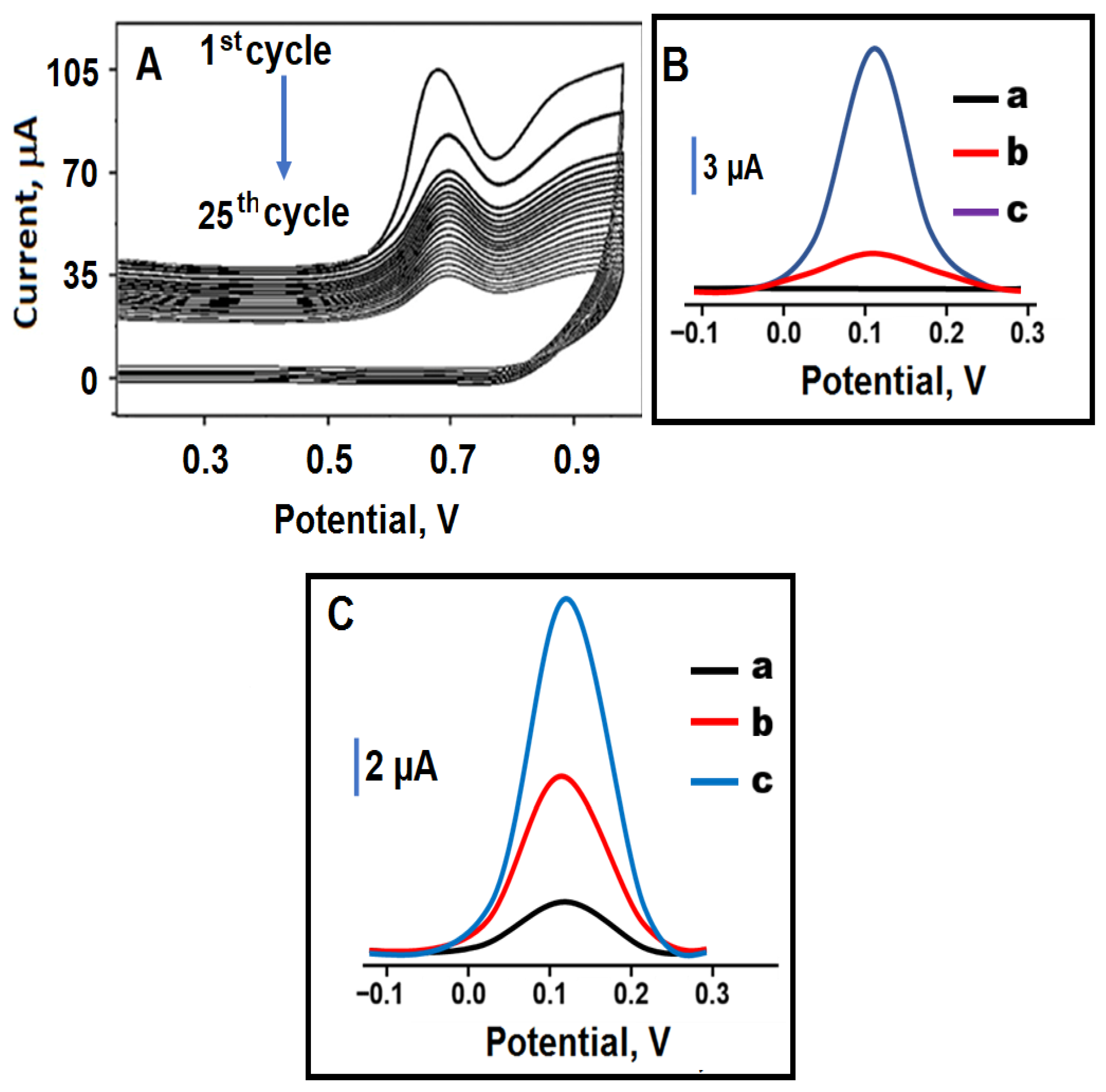 In MIP sensor applications, scan cycle values should be optimized since a thick polymeric layer on the electrode surface can prevent the removal target molecule from the electrode surface. In the opposite case, sensor sensitivity may be negatively affected because a thin polymeric surface can break away from the electrode surface. Several scan cycles in the range from 15 to 55 were investigated on currents. In conclusion, the scan cycle number of 25 was selected as optimum scan cycle (Figure S4D).