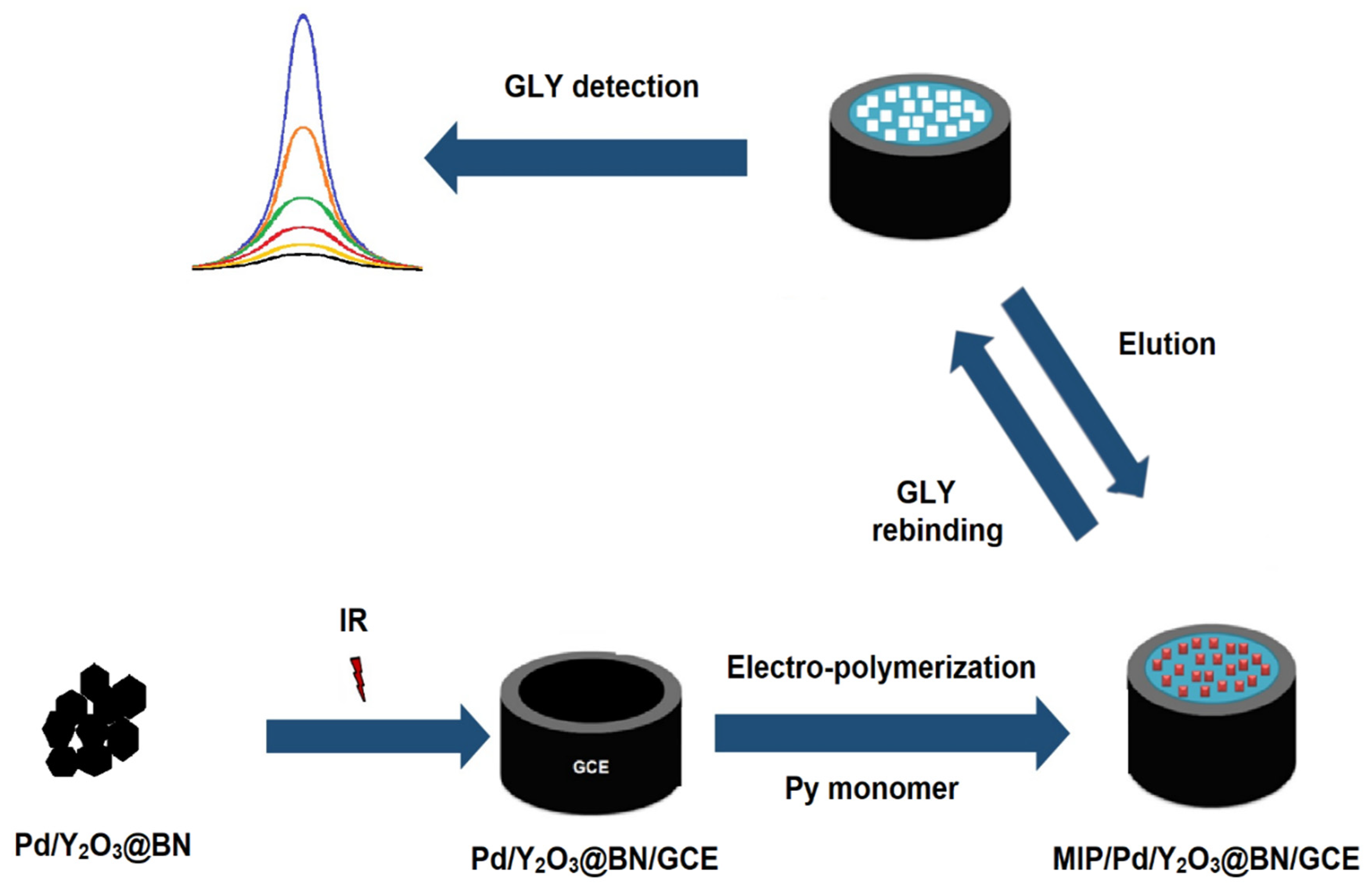 Here, we developed a sensitive and specific detection method based on palladium@yttrium oxide@boronnitride nanocomposite and molecularly imprinting polymer for GLY assay. MIP/Pd/Y2O3@BN/GCE showed superior electrochemical properties for herbicide determination owing to the synergistic function of boronnitride, Y2O3 and palladium. The sensor accomplished a current of 14.04 µA, which was up to 8.02 times higher than that of NIP/Pd/Y2O3@BN/GCE electrode. Under optimal conditions, the limit of detection for this prepared MIP electrode was observed as 3.3 × 10−10 mol L−1 in range from 1.0 × 10−9 to 1.0 × 10−8 mol L−1 GLY. Additionally, this prepared MIP electrode revealed excellent selectivity, stability, repeatability, and reproducibility. MIP/Pd/Y2O3@BN/GCE also showed good performance in drinking water applications with recoveries of 99.85–100.22% for GLY determination. This study highlighted the high potential of Pd/Y2O3@BN nanocomposite as low-cost materials for herbicide assays in environment and food samples. Future experiments will focus on improving the long-term stability (exceeding 8 weeks).