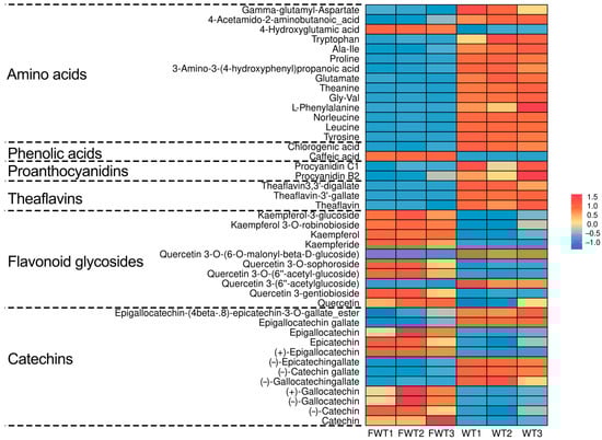 Heat map of the contents of 43 significantly differential compounds in FWT and WT extracts.