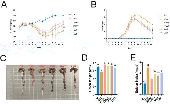 As shown in Figure 2A,B, the body weights of the mice in the experimental groups were lower, and the Disease Activity Index (DAI) scores were significantly higher compared to the CK group during the DSS treatment. Following the cessation of DSS treatment, both body weight and DAI scores began to recover gradually. Notably, the HFWT, LFWT, HWT, and LWT groups exhibited a more pronounced recovery trend compared to the DSS group. Additionally, these groups significantly mitigated (p < 0.05) the symptoms of colon length shortening and spleen index increase induced by DSS, as illustrated in Figure 2C–E. These results indicated that both FWT and WT interventions could alleviate symptoms in DSS-induced mice, with HFWT demonstrating the highest efficacy (p < 0.05).