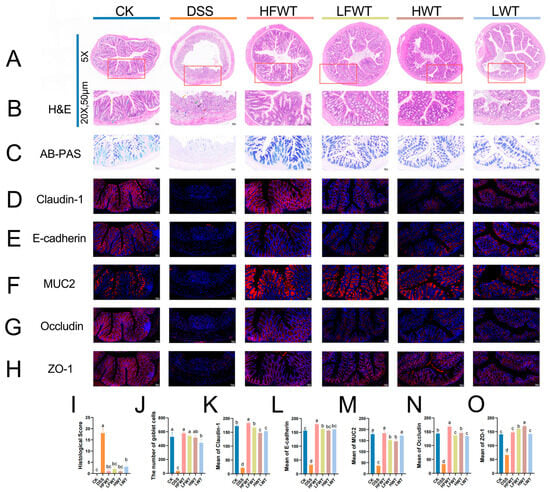 AB-PAS staining revealed that DSS treatment severely reduced goblet cells and degraded the mucin layer, which was significantly mitigated by HFWT, LFWT, HWT, and LWT interventions (Figure 3C,J). FWT groups demonstrated superior goblet cell restoration versus WT groups. Immunofluorescence (Figure 3D–H) showed that DSS significantly downregulated the expression of claudin-1, occludin, ZO-1, E-cadherin, and MUC2 (p < 0.05), while all treatments markedly upregulated these proteins (p < 0.05; Figure 3K–O). Collectively, the treatments, particularly HFWT, effectively repaired the intestinal mucosal barrier and maintained its integrity.