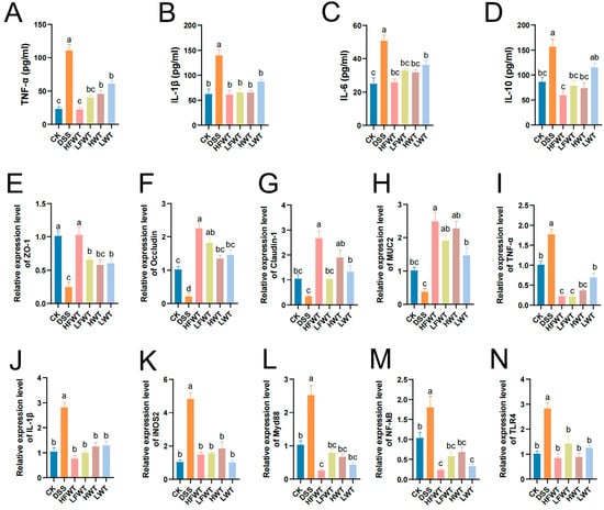 FWT modulates cytokine levels and gene expression. (A–D) Serum cytokines (TNF-α, IL-1β, IL-6, IL-10). (E–N) mRNA levels of barrier and immune-related genes (ZO-1, Occludin, Claudin-1, MUC-2, TNF-α, IL-1β, iNOS2, Myd88, NF-κB, TLR4). Data: mean ± SEM, n = 5. Letters denote significant differences (p < 0.05).